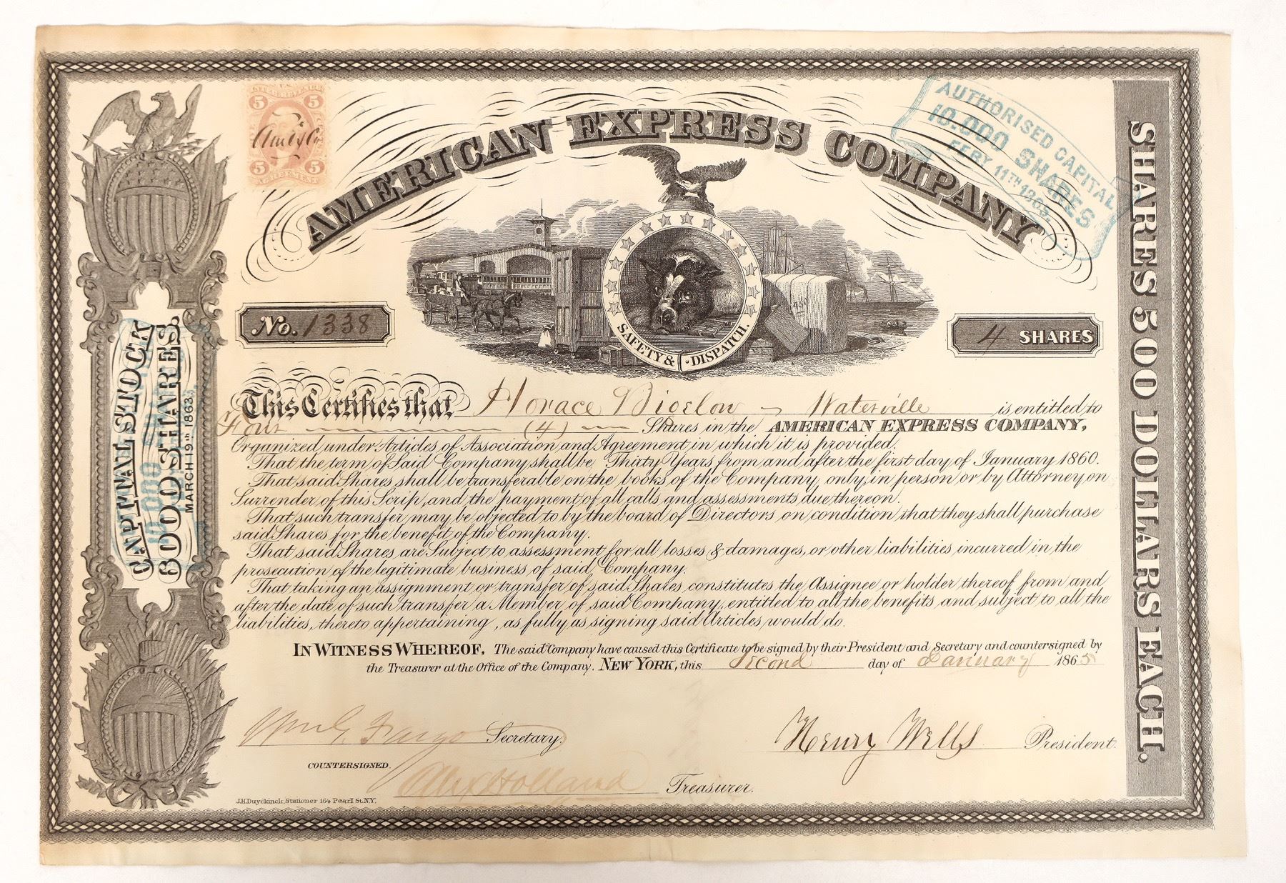 This is an American Express stock certificate signed by William Fargo and Henry Wells. Wells and Fargo were known for their innovation and dedication to customers. They created a joint-stock company to provide banking and express services to support the California Gold Rush. Their services included transporting gold, mail, supplies, and bank notes between New York and San Francisco. This cert is issued to Horace Bigelow Waterville for four shares at $500 per. It has a five cent red Washington stamp affixed. It's dated January 2, 1865 and cancelled. In VERY nice condition. Please see photos for more details.