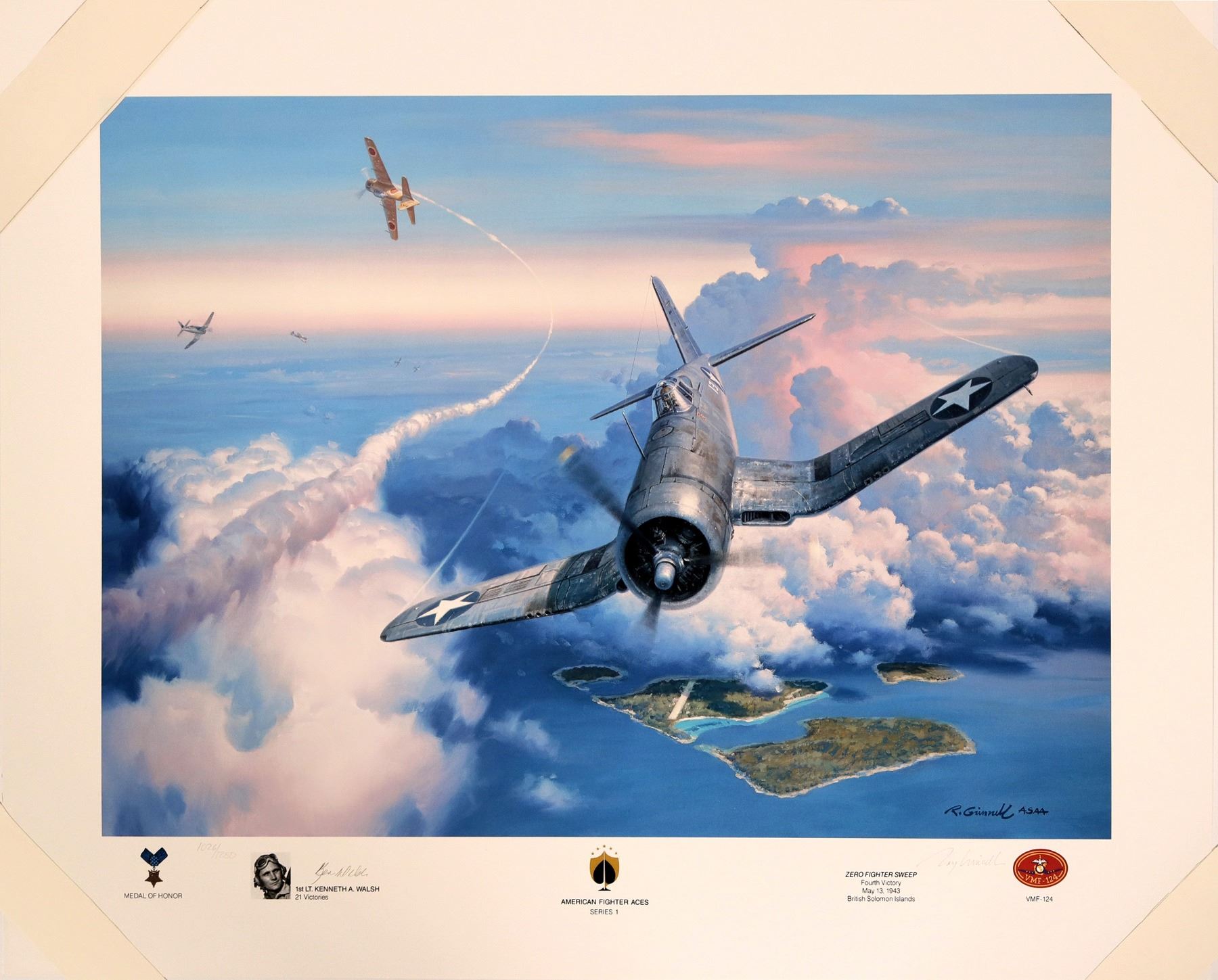 30" by 24" overall size, limited to 1250, Signed by the Artist and hand signed by the First Corsair Ace Lt. Kenneth A. Walsh, Medal of Honor recipient and the artist.. #1026/1250, 30x24 mounted on cardboard background (not permanent).