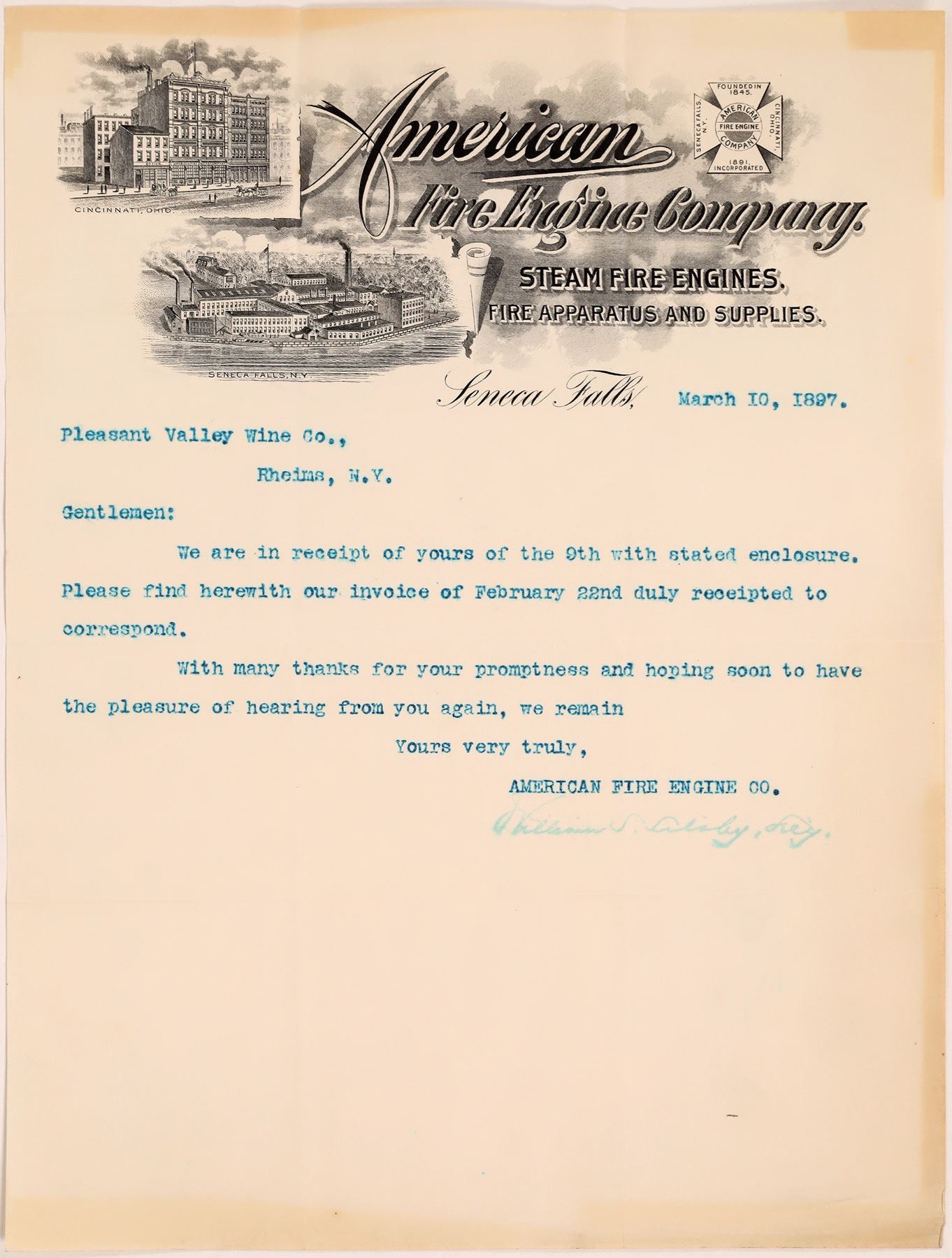 Letter the American Fire Engine Company of Seneca Falls, New York dated March 10, 1897, to the Pleasant Valley Wine Company of Rheims, New York. Vignettes of factories and offices of the maker of steam fire engines, fire apparatus and supplies.