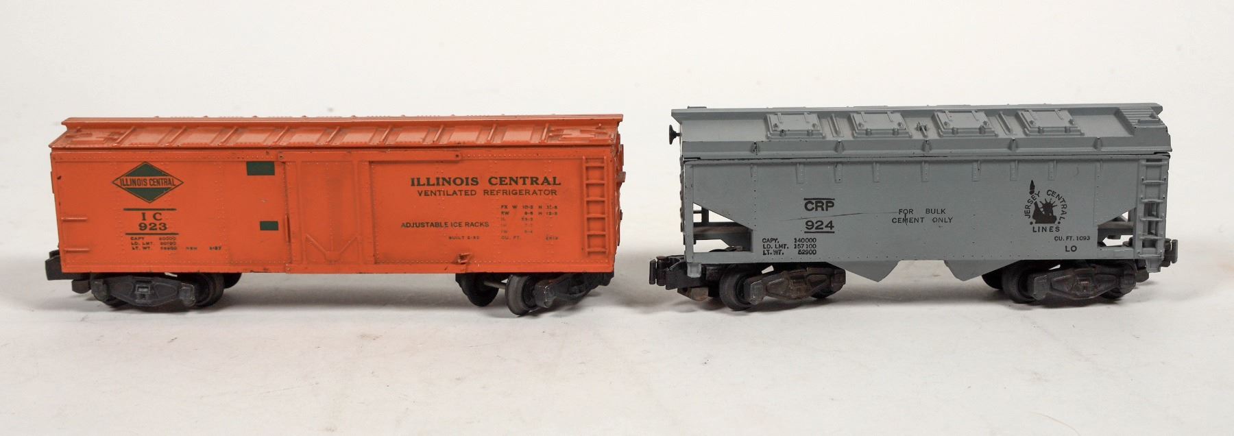 Lot of 4. C7-8. cond. 983 Missouri Pacific Lines "Eagle Merchandise" Box Car, Illinois Central 923 Box Car , CB&Q 24206 "Every where West" coal car, CRP 924 "Jersey Central Lines" cement bottom dump.