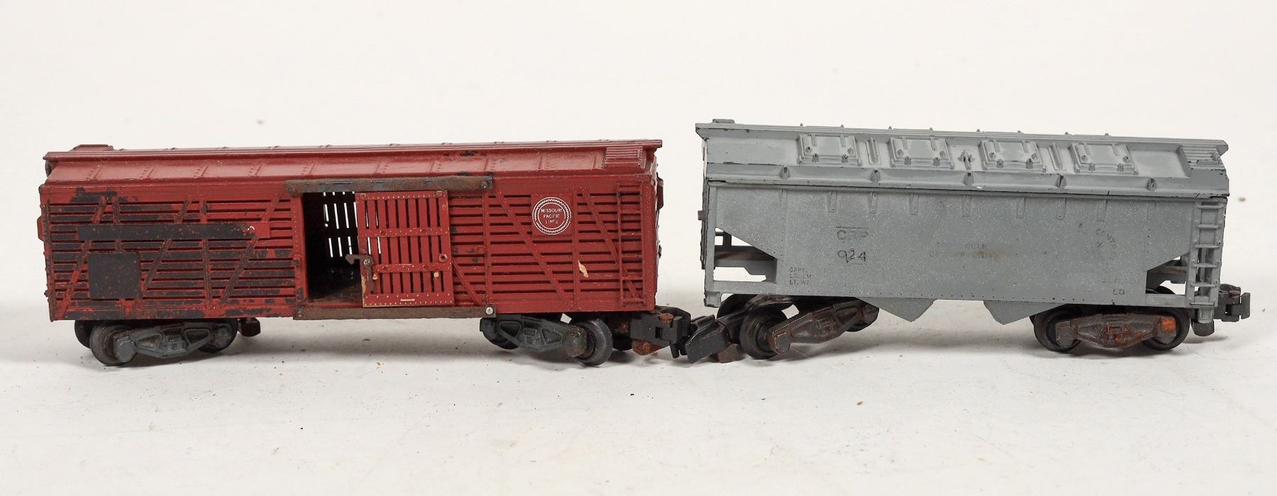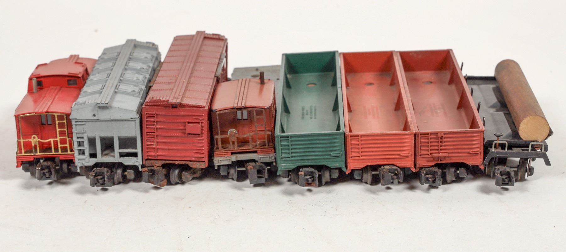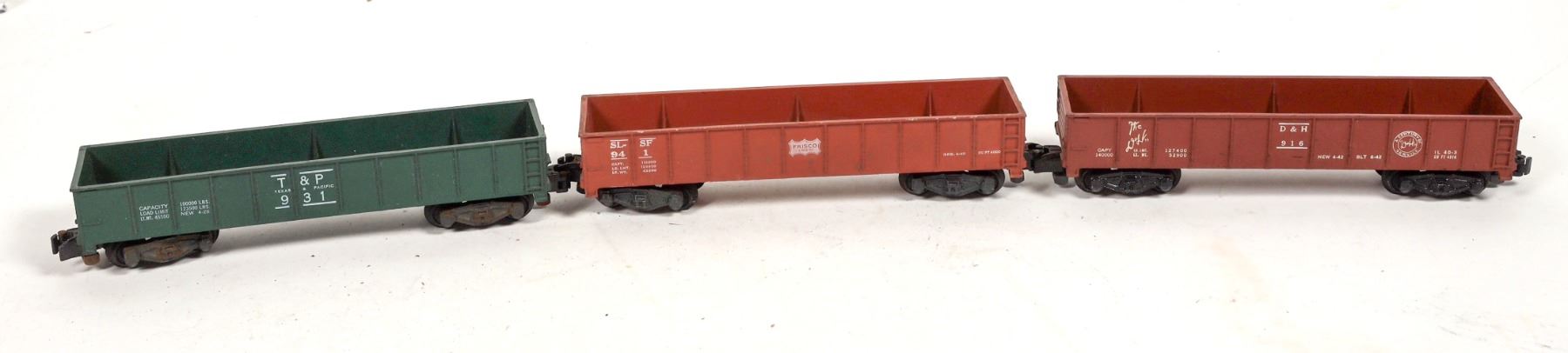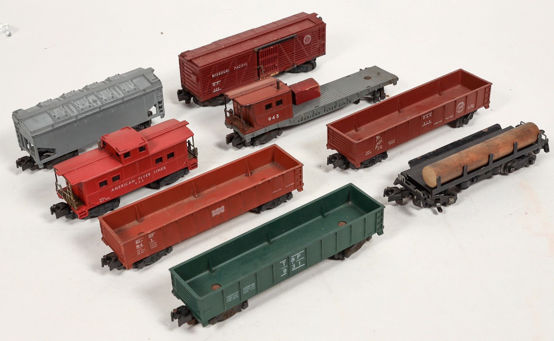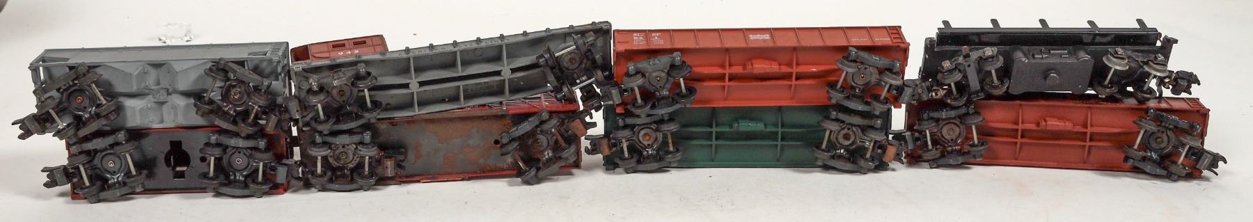 Lot of 8. C7P Cement Bottom Dumps, Three gondolas : T&P, The D&H, Friscp. Log car, 945 crane tender, 929 Missouri Pacific livestock car. Varying conditions. removed from active layout.