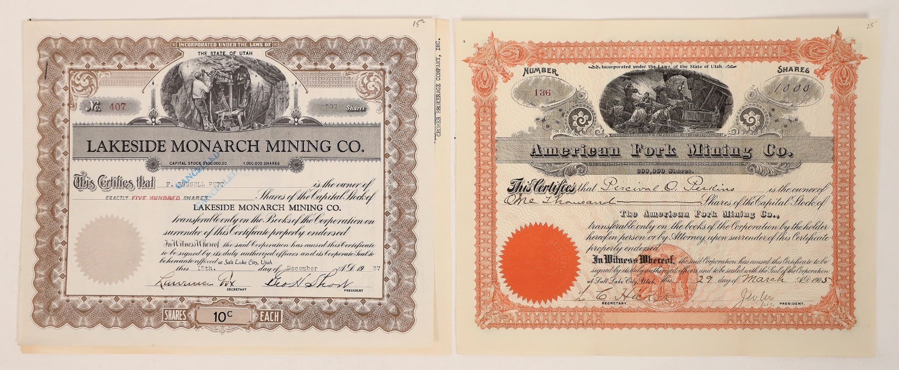 All issued. 1905 American Fork Mining. 1937 Lakeside Monarch Mining, located in Lakeside district in Tooele county near American Fork.[ American Fork Utah
