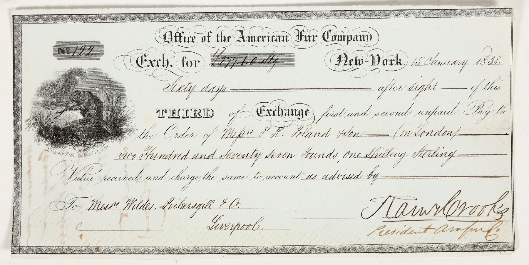 Very rare. Dateline New York January 15, 1838. Issued for 372 pounds, signed by Crooks. Vignette of beaver! 4 x 8" The American Fur Company was founded in 1808 by John Jacob Astor to control the U.S. fur trade, challenging Canadian competitors like the Hudson's Bay and North West companies. It quickly became the dominant American trading enterprise, establishing posts throughout the Great Lakes, upper Mississippi, and Missouri River regions, and eventually in the Rocky Mountains. By the 1830s competition, declining beaver populations, and changing fashions led to its decline, and Astor sold the company in 1834, marking the end of its fur trade dominance.