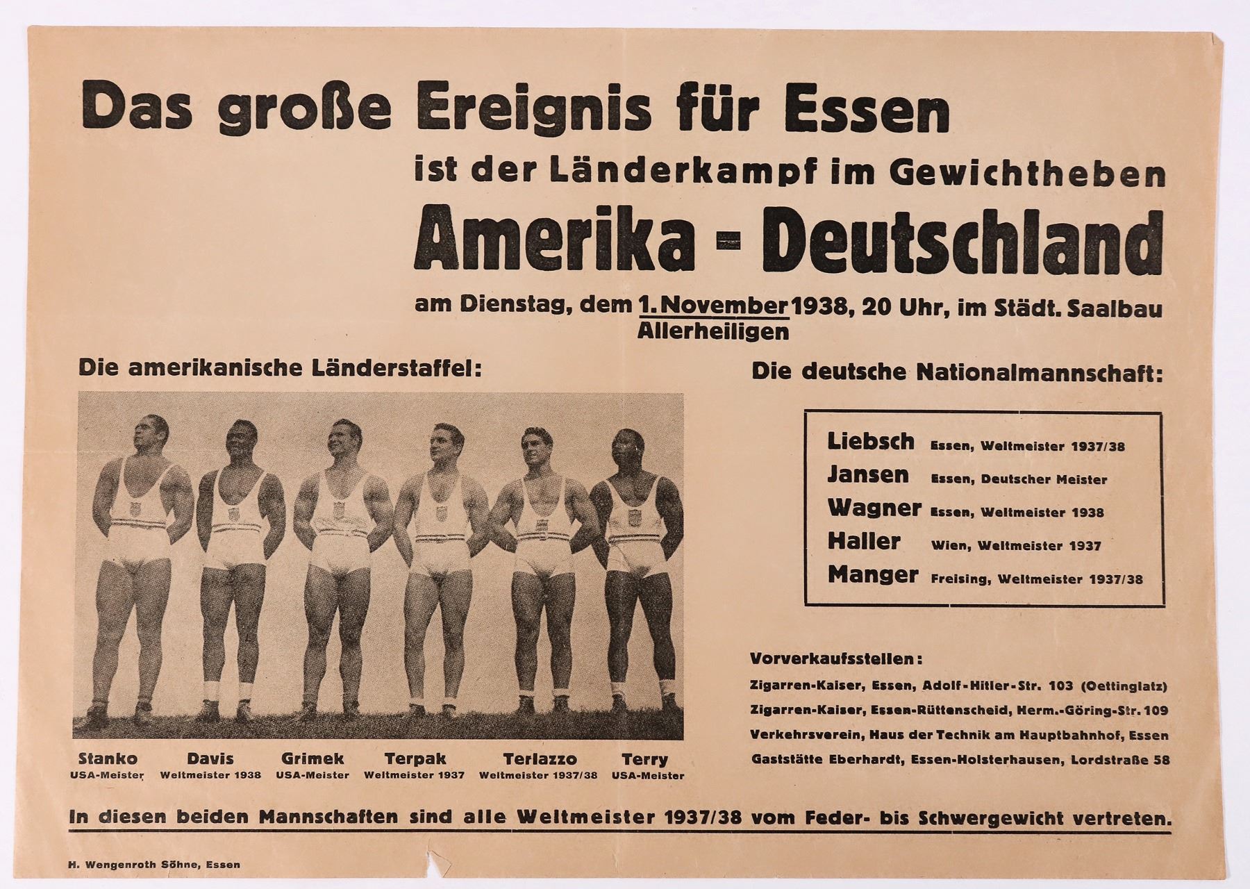 1938 American and German sports broadside featuring male athletes from both countries. Printed in Germany, 8.25x11.5", 2 small dogears. Germany 1938