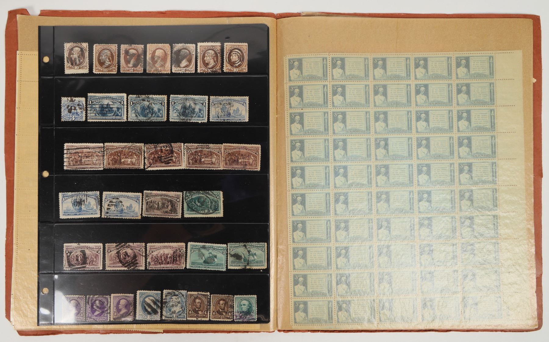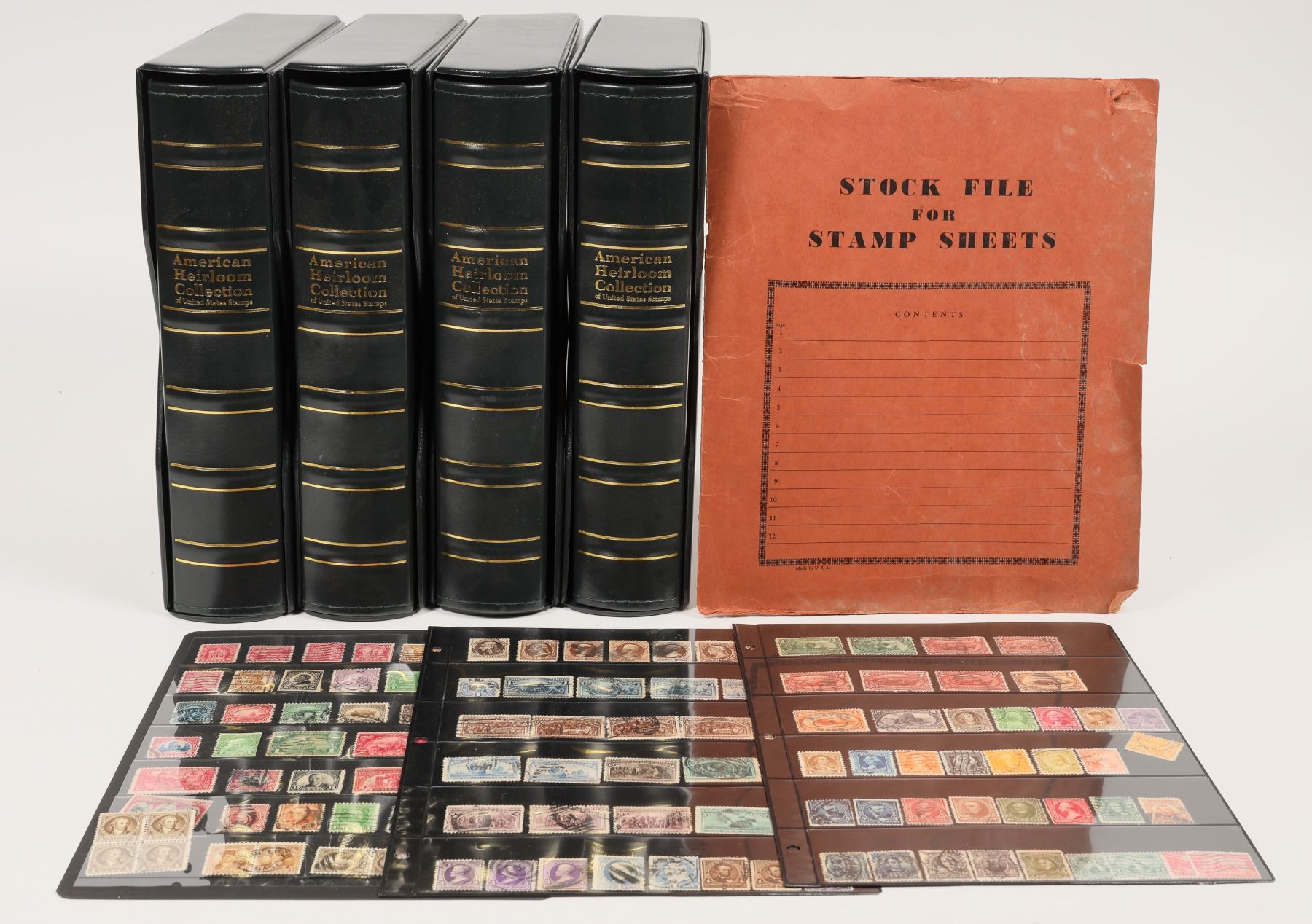 American Heirloom Collection Binders for U.S. Stamps - 4 Like new stamp binders less than 10% full with great spot to put in Mint Commemoratives. Also included with this lot is a folder labelled "Old Stamps" containing about 255 mostly canceled stamps in 3 laminated album pages and about 17 different unused stamp sheets/partial sheets. The stamps present have NOT been evaluated or cherry picked. The true value contained herein is a mystery awaiting discovery by the winning bidder!