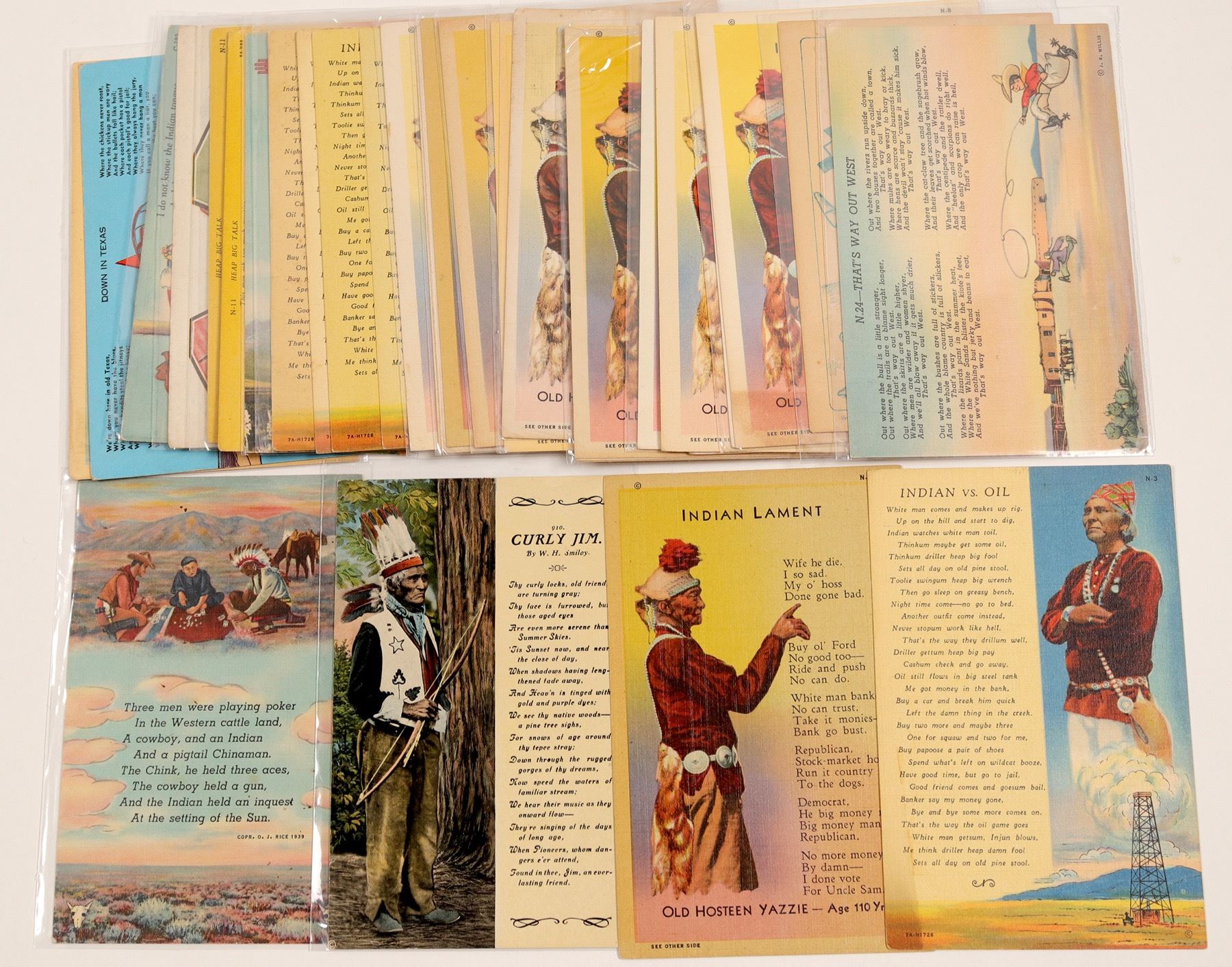12 original and 21 duplicate American Indian poetry post cards including "Indian Lament" by Old Hosteen Yazzie, 110 years old, "That's Way Out West" and "Curly Jim" by W. H. Smiloy.