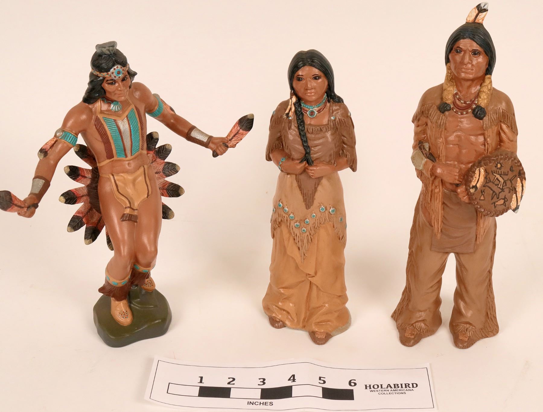 Three pottery figures depicting three American Indians. The Warrior stands 12" and holds a war shield, the Indian woman stands about 10" and has a pensive pose, while the eagle dancer is about 11" in height. All three are in very nice condition, ready for the mantel. See photos for more detail and condition.
