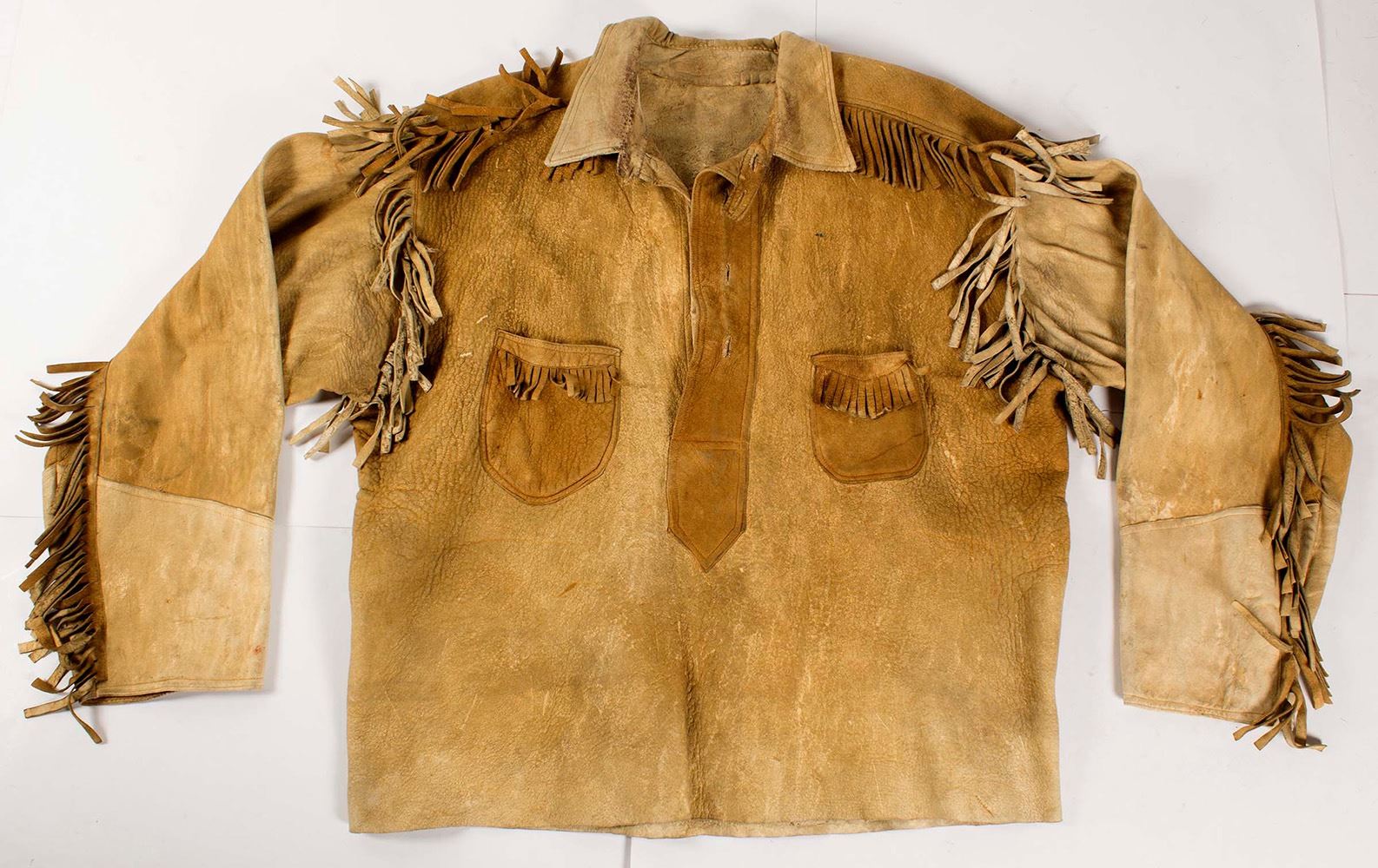 This is a handmade Indian war shirt made of buckskin. Piece measures 24" from collar to tail, 18" across the body and 22" sleeves. Garment is fringed, used but in very good condition. Date: Location: HWAC# 56632