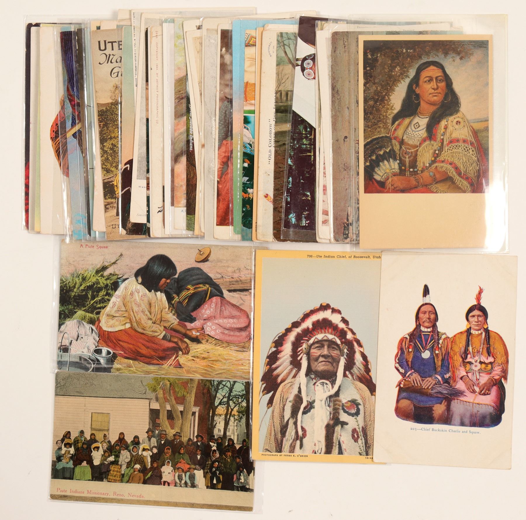 57 different and 1 duplicate of black /white and colored postcards. Include Nevada, Paiute, Shoshone / Bamock, Washoe, Ute and Mojave Indians. Pictures include Chief Buckskin Charlie and Squaw, Baby in papoose in Reno, NV and Ute Indians living in Northeaster Utah with approx 1600 members. Brian Thaler Collection