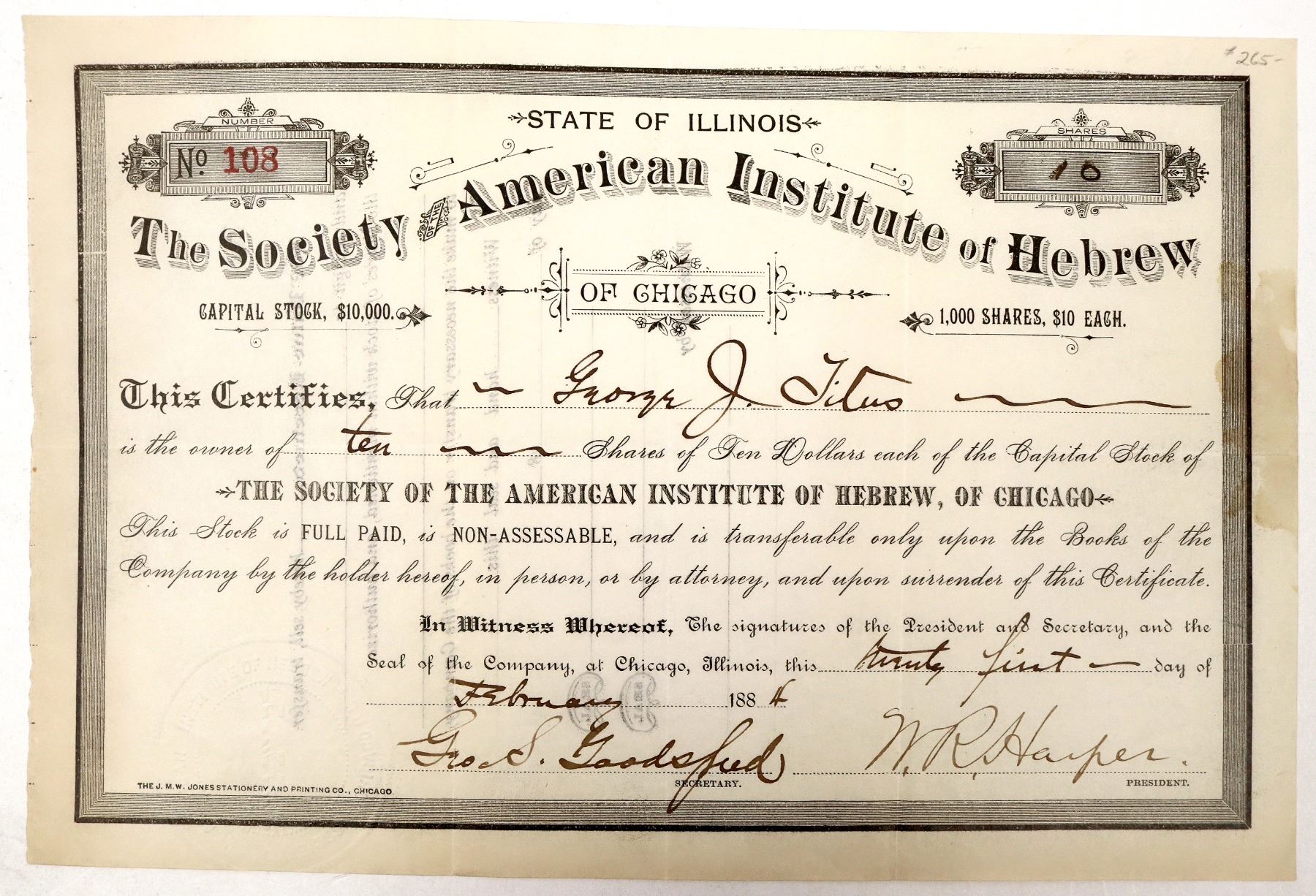 A stock certificate for ten shares in the Society of the American Institute of Hebrew, dated 1884. The American Institute of Hebrew, which was later renamed the American Institute of Sacred Literature, was a Chicago-based organization dedicated to Christian education of adults. The stock certificate is made out to George J. Titus and is signed by the president and founder of the American Institute of Hebrew, William Rainey Harper. It is also signed by the company's secretary and bears the official seal of the company. Excellent condition.