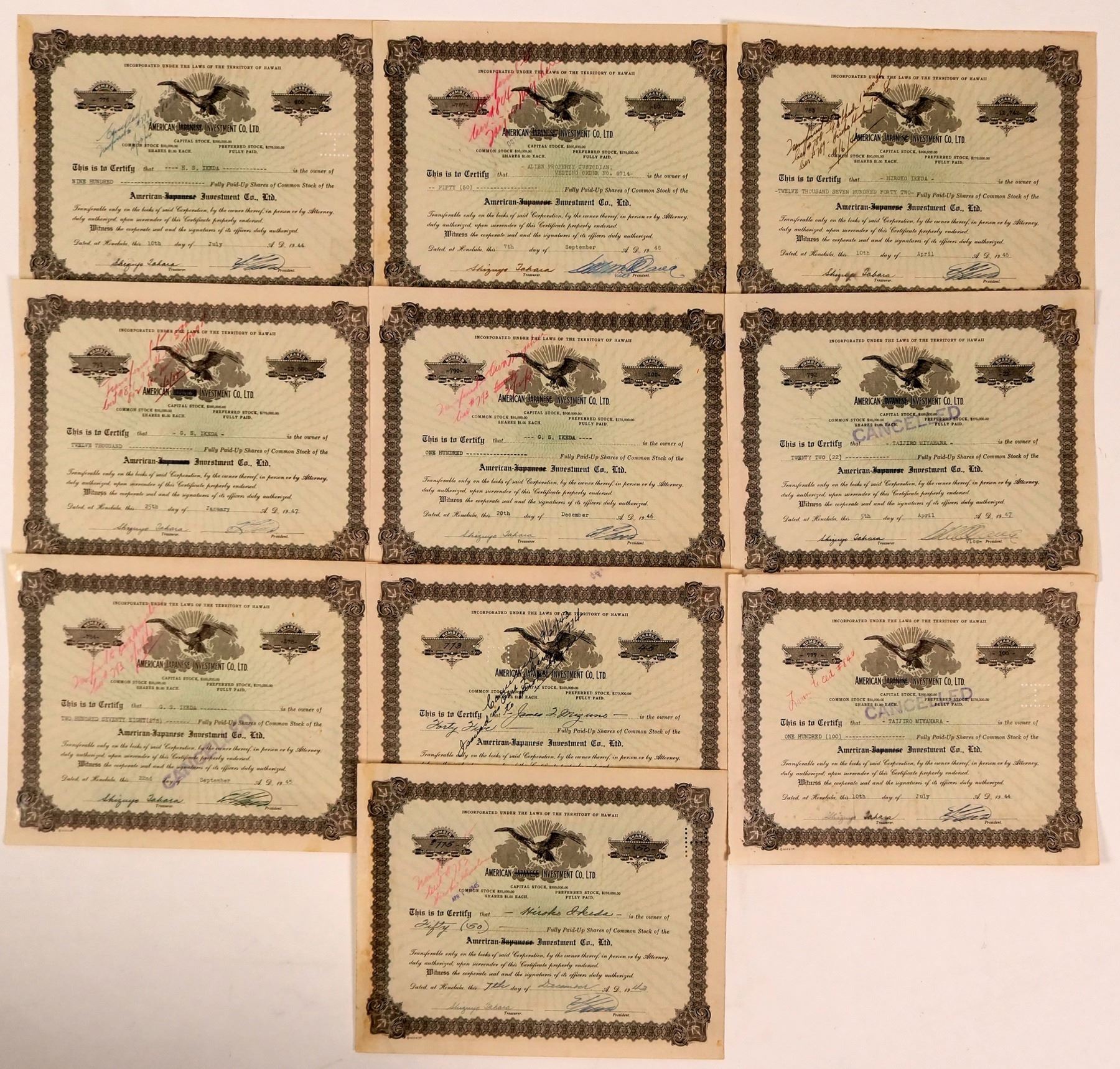 Lot of 10. Issued in Honolulu during World War II, 1943-1947. This likely explains why "Japanese" has been crossed out on the stocks! Inc. in the Territory of Hawaii. Black border, eagle vignette. Folds, some with heavy toning. According to a 1918 ad in the Honolulu Advertiser, the company was formed for Japanese people in Hawaii to buy home sites and invest in Hawaii.
