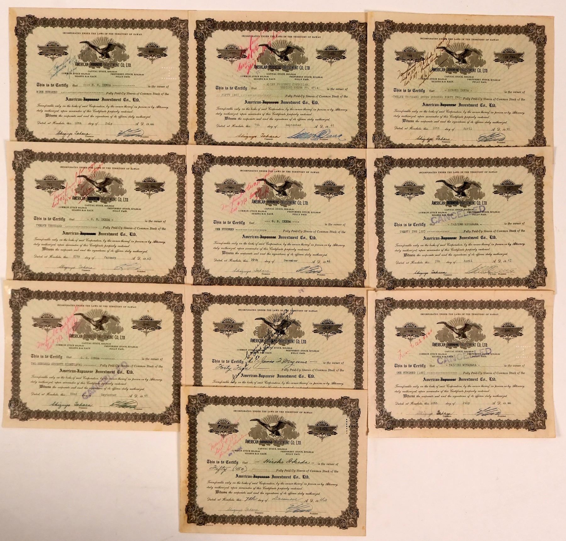 Lot of 10. Issued in Honolulu during World War II, 1943-1947. This likely explains why "Japanese" has been crossed out on the stocks! Inc. in the Territory of Hawaii. Black border, eagle vignette. Folds, some with heavy toning. According to a 1918 ad in the Honolulu Advertiser, the company was formed for Japanese people in Hawaii to buy home sites and invest in Hawaii. Hawaii Honolulu 1943-1947 Ken Prag Collection