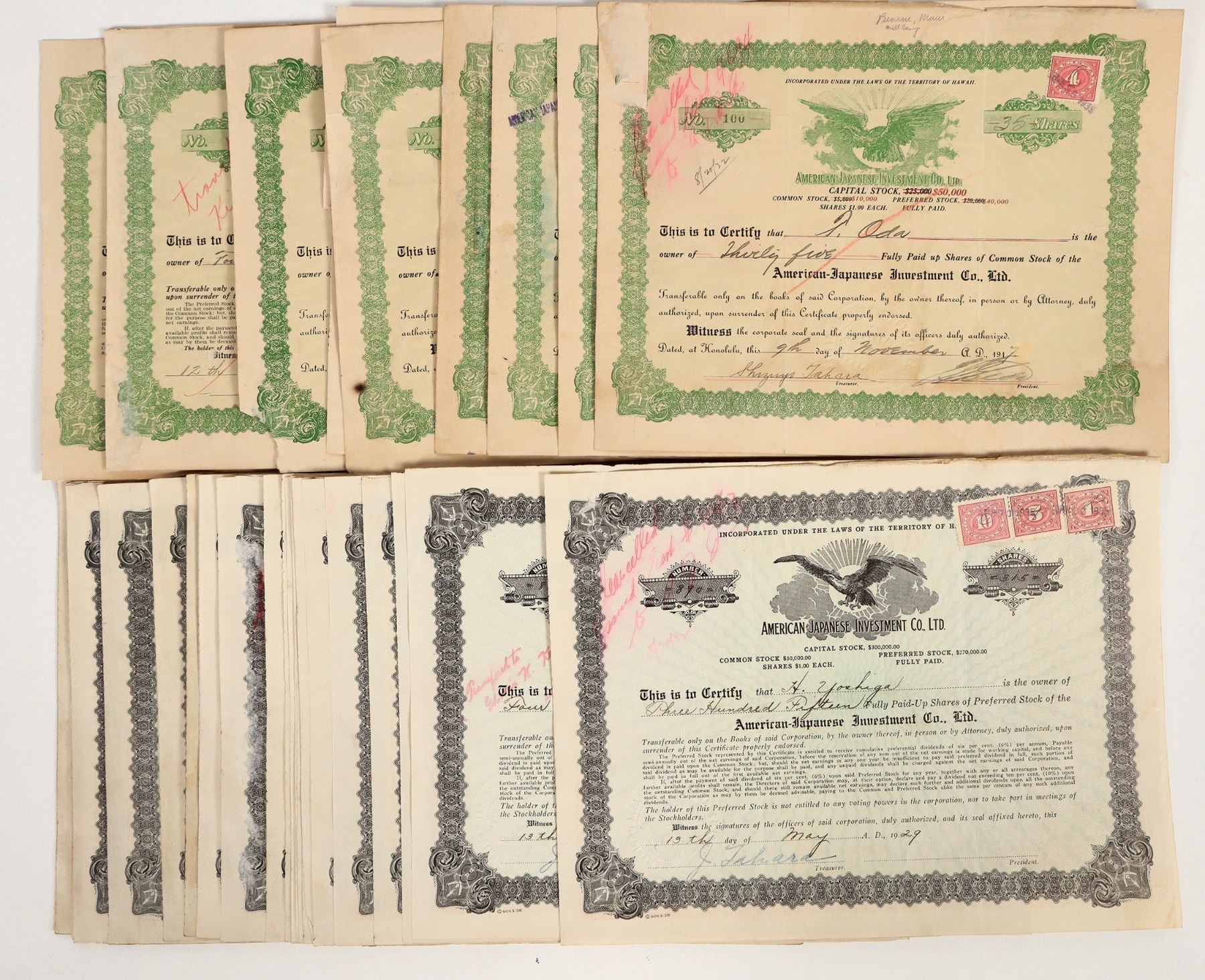 About 35 American Japanese Investment Co. Stocks c. 1917, 1929. All issued. Two varieties. 10 issued 1917, 25 issued 1929. Some with revenue stamps, embossed seals, additional signatures on reverse.