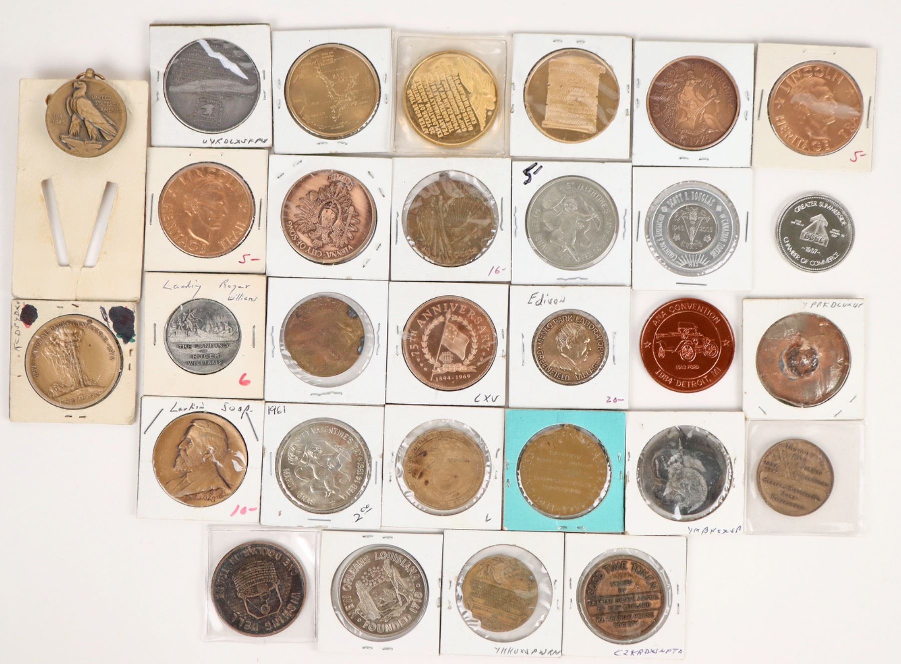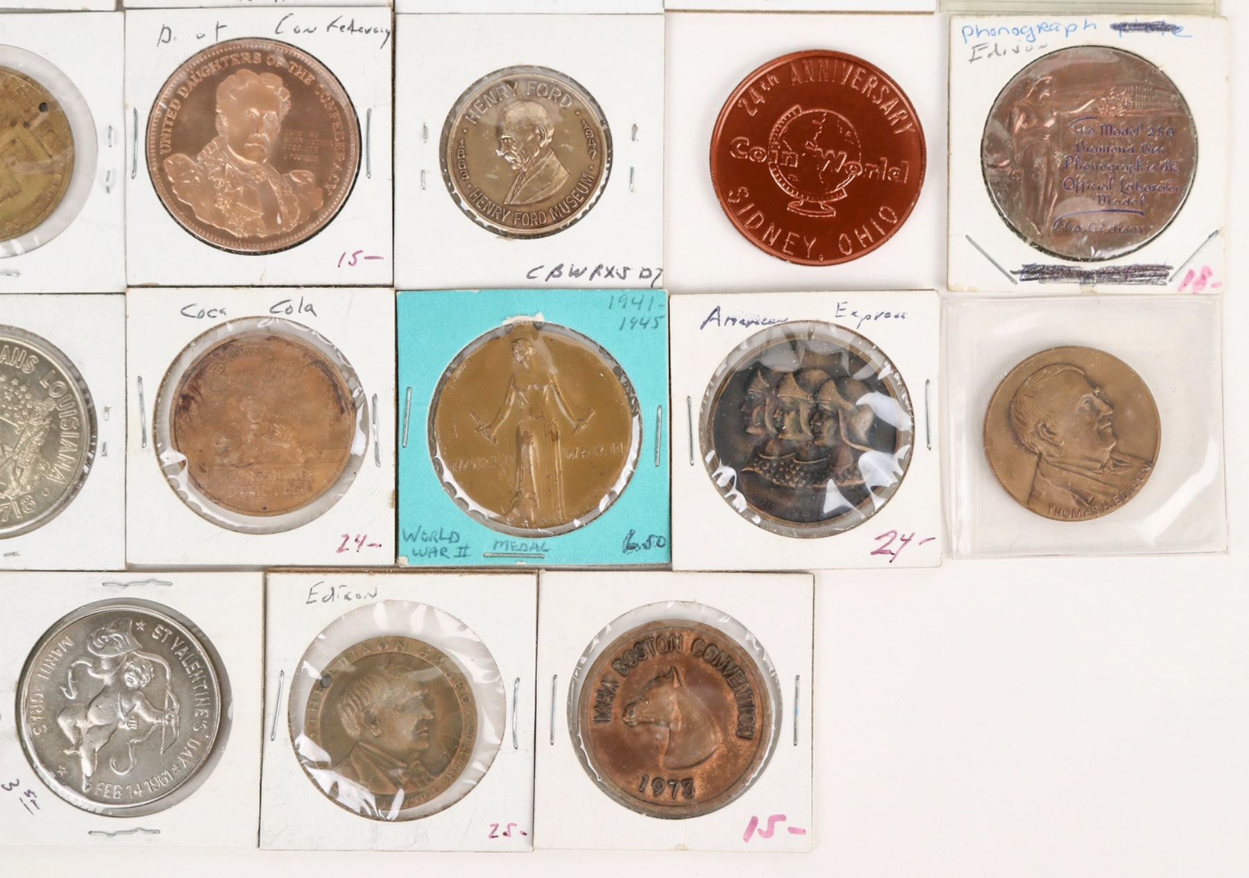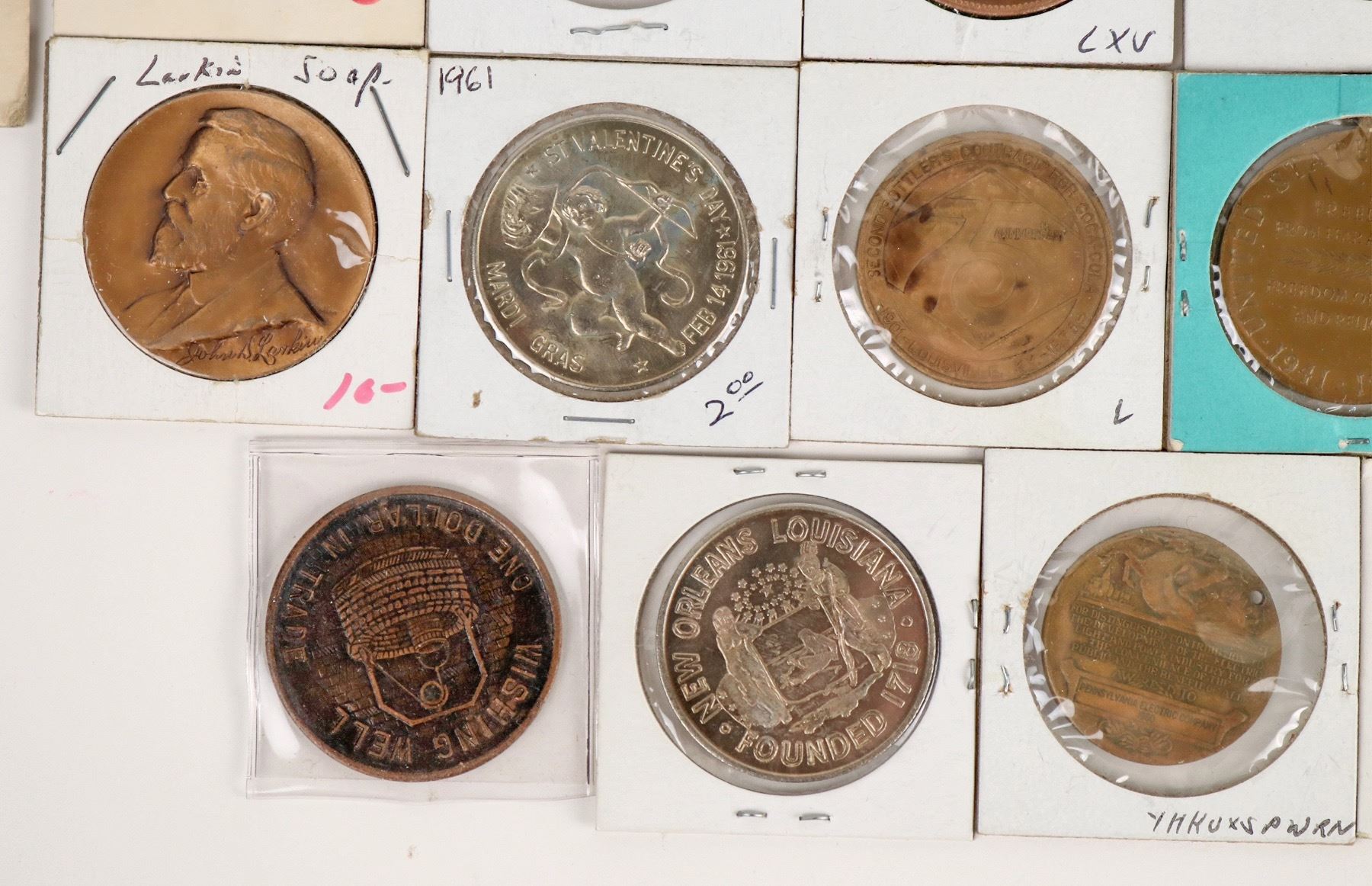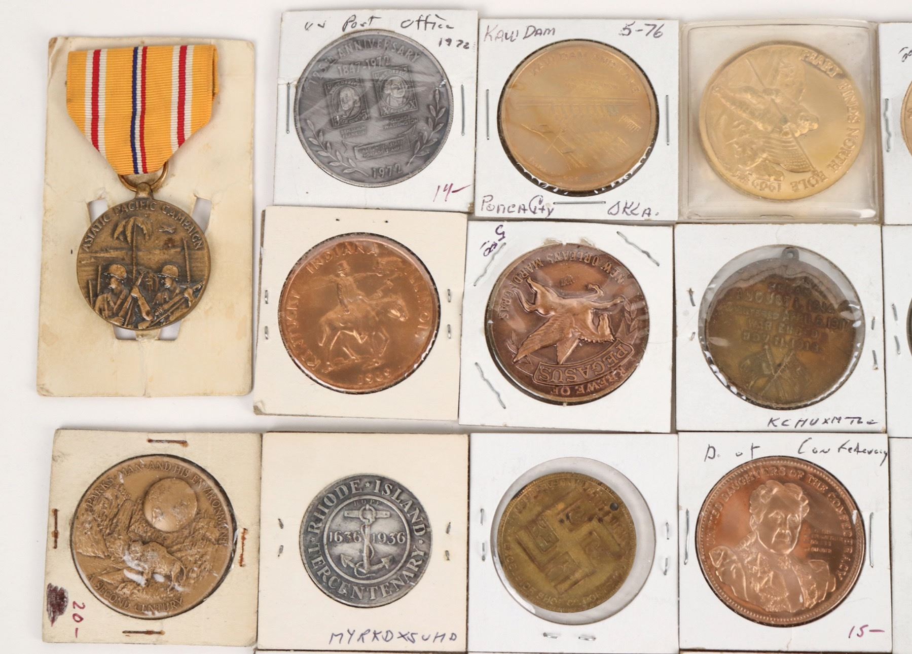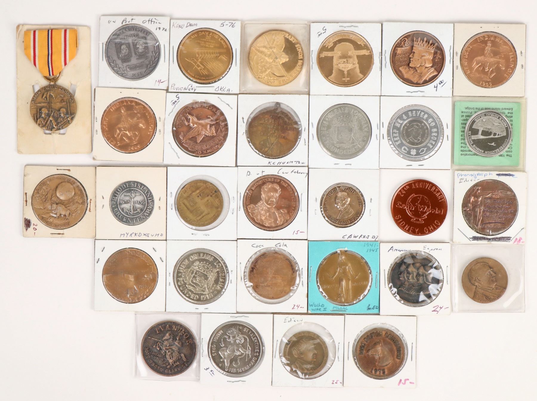 Lot of 30 medals: Asiatic Pacific Campaign 1941-45; 1910 Excelsior Shoes; 1969 Lincoln Heritage Trail; Kaw Dam, Ponca City, Oklahoma; 1975 Mardi Gras; 35th anniversary Bataan; 1972 U. S. Postal Service; Coca Cola; American Express; United Daughters of the Confederacy; and many more.[