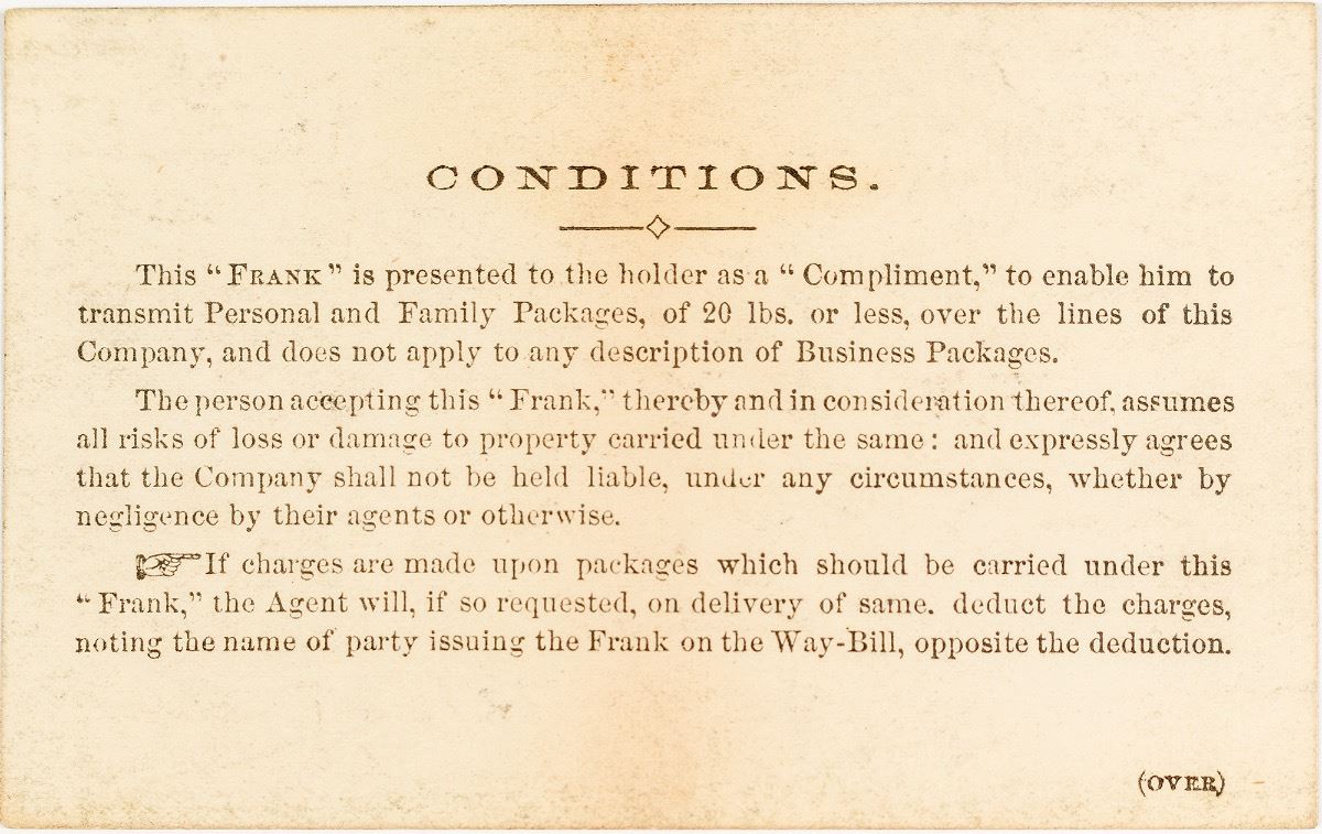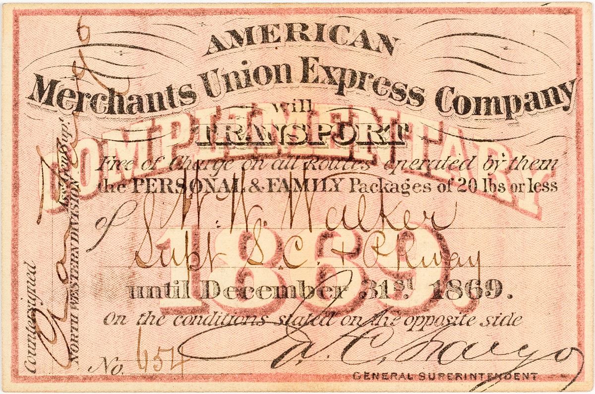 Early express piece! No. 654, issued for 1869 to W.W. Walker, superintendent of the S.C. & R. Railway. Ja. C. Fargo as president. Countersigned by Charles Fargo (Fargo brothers). Printed on cardstock with pink background. Some soiling. (Prag Collection) City: State: Date: Inventory# 39211