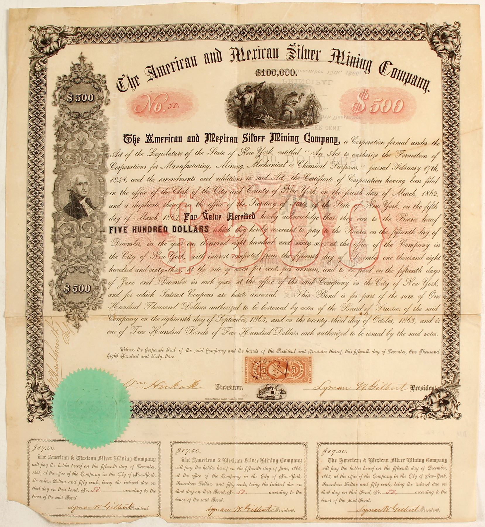 Bond number 50. Signed by William Hickok treasurer and Lyman W Gilbert president. Bonded in New York with mines in Chihuahua, Mexico. Three of the coupons remain (although cut unevenly at bottom). United States 25c brown Power of Attorney stamp. Faded green seal. 15.5 x 13.75". Holes at fold intersections - otherwise in good condition. We could find no information on this company. This company held the Setentrion Mines in Chihuahua. It was originally incorporated as the American & Mexican Mining Company. This company was also active in the Arivaca area of Arizona.