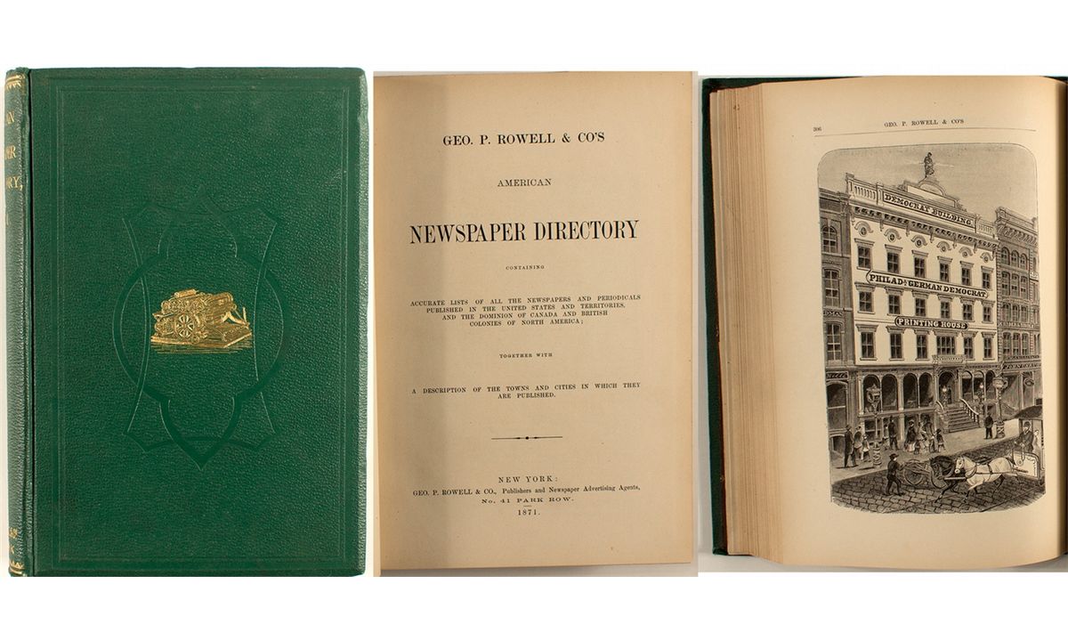 This year not found on OCLC. "Containing an accurate list of all the newspapers and periodicals published in the United States and Territories, and the Dominion of Canada and British Colonies of North America; together with a description of the towns and cities in which they are published." Geo. P. Rowell & Co, New York. 1871. 576 pages. Green cloth covers with gilt lettering. Index to States. Gives publication schedule, subscription rates and circulation. Large portion of the book is a Newspaper Directory Advertiser which has its own index (organized by state). Condition: Ex-library. Minimal wear to covers. Toning and a few folded/torn pages. Binding tight. Overall, a very nice copy. Rarity: [i]City: County: State: Date: