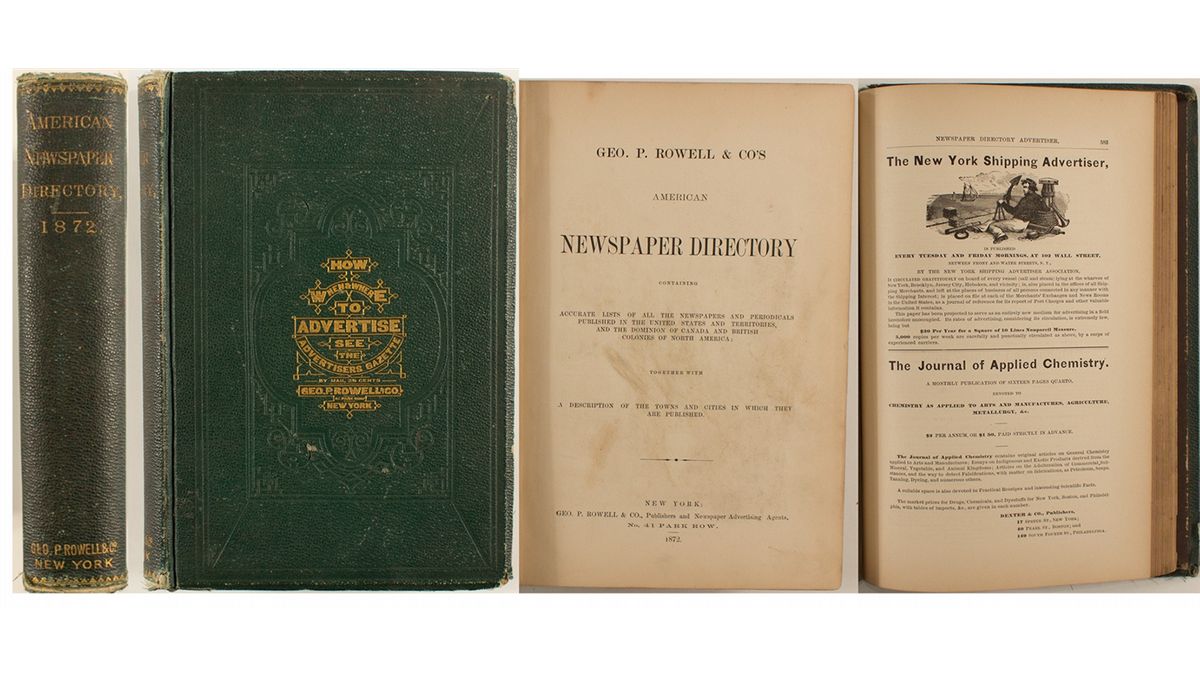 Geo. P. Rowell & Co., New York. 1872. 680 pages. Green cloth covers with gilt lettering. Copy of the Merchants' Exchange News Rooms in Portland, ME. Index to States. Gives publication schedule, subscription rates and circulation. Large portion of the book is a Newspaper Directory Advertiser which has its own index (organized by state). Condition: wear to covers. Soiling and toning of pages. Some pages brittle. Rarity: [i]City: County: State: Date: