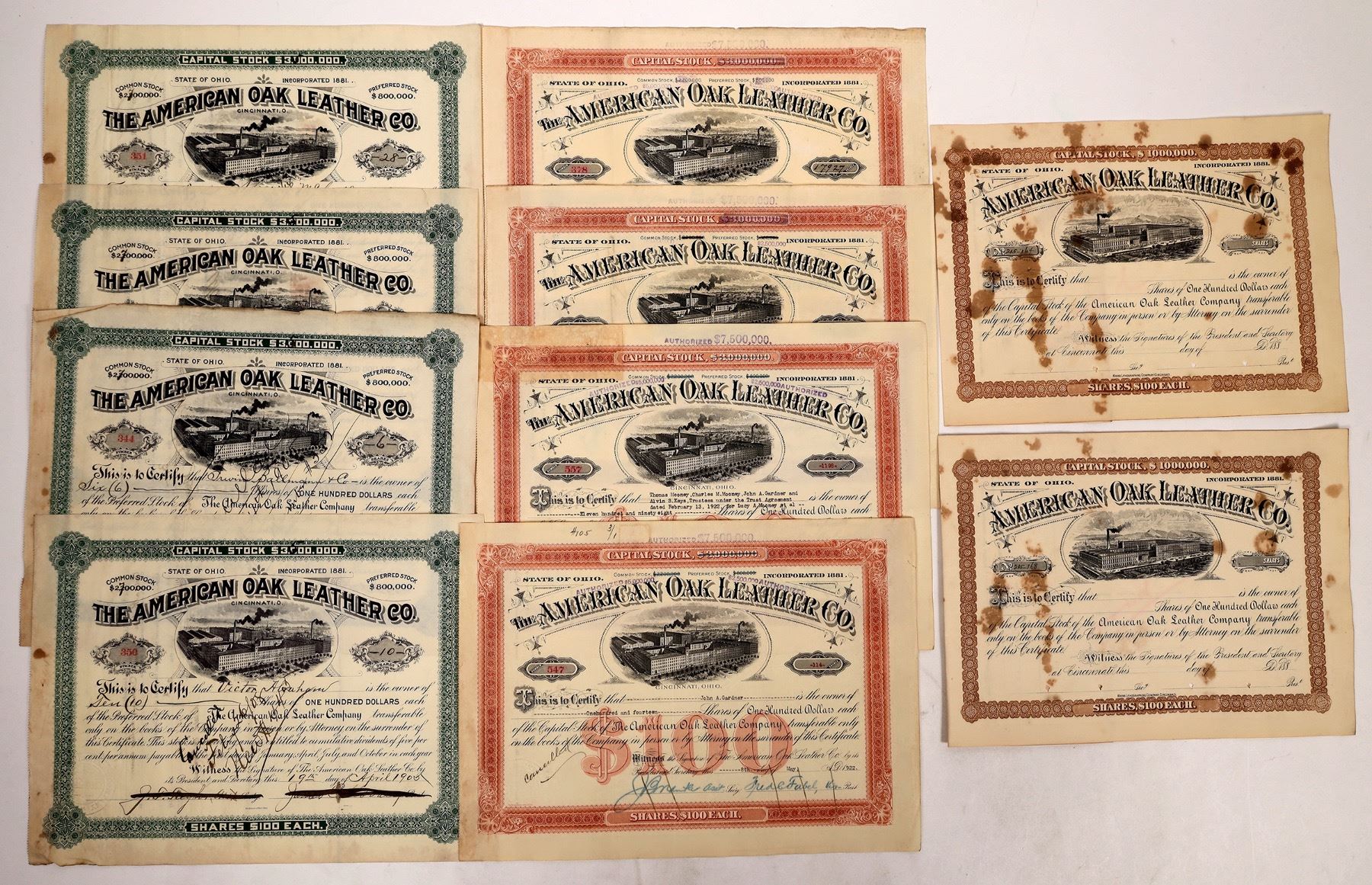 10 American Oak Leather stocks in a few varieties. c. 1905-22, mostly issued. Some are stained, please inspect. Ken Prag Collection