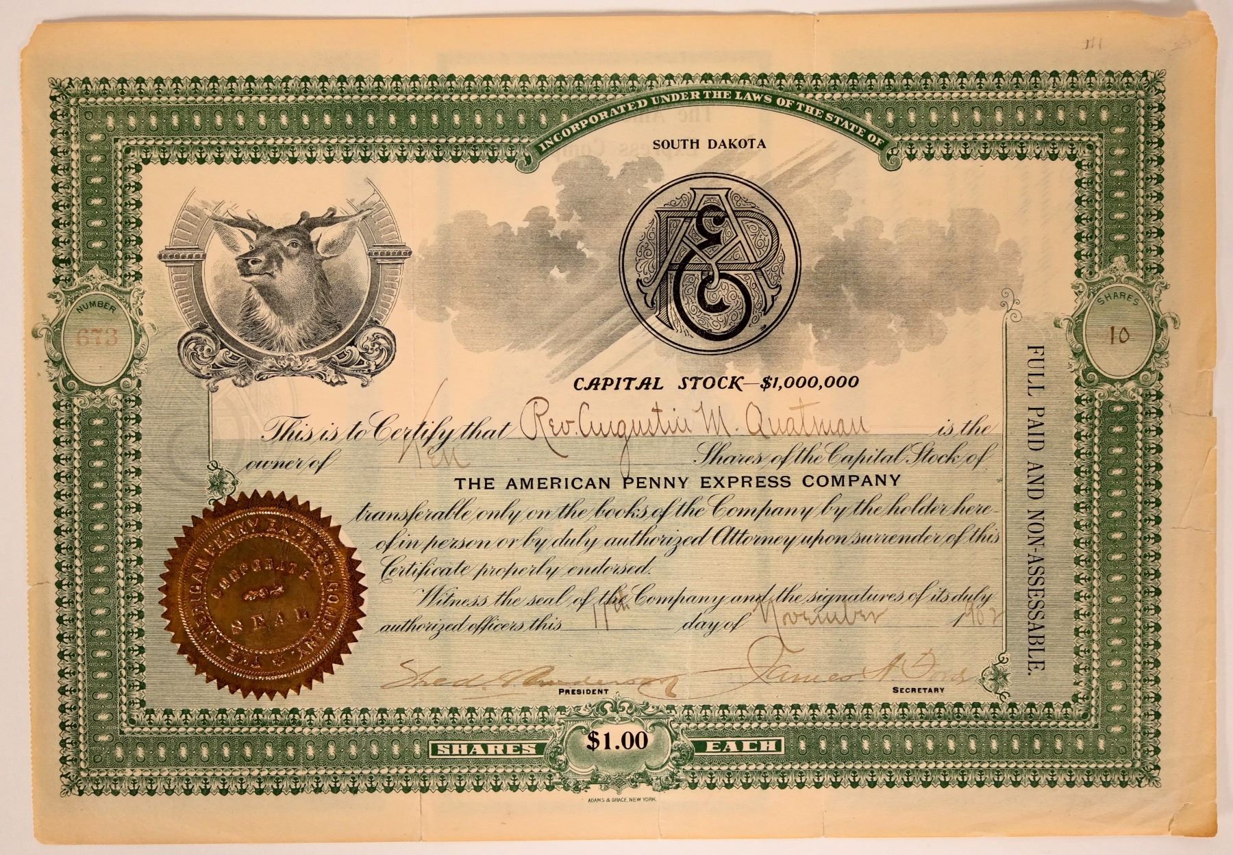 Rare. Inc. in South Dakota. No. 673, issued for 10 shares to Rev. Augustine Quatman on November 11th, 1902. Signed by president Frederick Anderson and secretary James Ford. Not cancelled. Green border, gold seal, black print, and elk vignette. Printed by Adams & Grace, New York. Heavy folds, some tears and separation, and toning. 8 x 11.75" According to an ad for the company in The Commercial & Financial Chronicle (Vol. 75, 1902), the company: "We operate our system of wagons and distribute advertising matter, circulars, samples, catalogues, magazines, etc, direct to the homes, at a cost of only one cent each. We also receive for delivery at current rate parcels and packages consigned to any part of the world. We also call for and deliver parcels and packages to any address in New York City for 10 cents apiece. We are increasing our facilities, are organizing new territory, and are negotiating for the purchase of other companies now operating." City: New York City State: New York Date: 1902