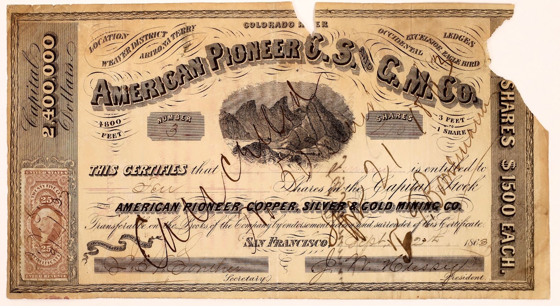 Incorporated August 1863. "Location Weaver District Arizona Territory" (printed at upper left). "Ledges Excelsior, Eagle Bird, Occidental" (printed at upper right). Low certificate #3, dated Sept. 2, 1863 for 10 shares made out to F. (Francis) G. Bornemann. (signed on back). Signed by President J. W. Hussey and Secretary J. (Joseph) N. Souther. Bornemann is listed in Langley's 1865 San Francisco Directory (p. 87) as working in the cashiers office of the U. S. Assistant Treasurers. Office at 606 Montgomery St., room #3 (notice of a $1 assessment levied; ref.: Daily Alta California, Volume 15, Number 4975, October 12, 1863). Souther is listed in Langley's 1865 San Francisco Directory (p. 410) as a receipt clerk in the U.S. Branch Mint. Cancelled. A vignette of mountains with a stagecoach. A brown 25 cent Internal Revenue Certificate stamp attached. Black on white; 5.5 x 9.5 inches, printer not identified. Two major tears. Cancelled. Old and wrinkled. Still a great find! The Weaver district is situated about 16 miles northeast of Wickenburg. A Mexican member of a prospecting group unearthed gold nuggets "the size of potatoes." The party members pried them from the ground with knives. Prospectors dubbed the basin the Potato Patch, the mountain Rich Hill and the mining region Weaver District No. 2. The district became Arizona's richest producer of placer gold. Major claims included the Devil's Nest, the Leviathan and the Upton. Miners poured into the district, panning more than 25,000 ounces of gold in the first five years. State:Arizona City:Weaver District Date:1863 Provenance: