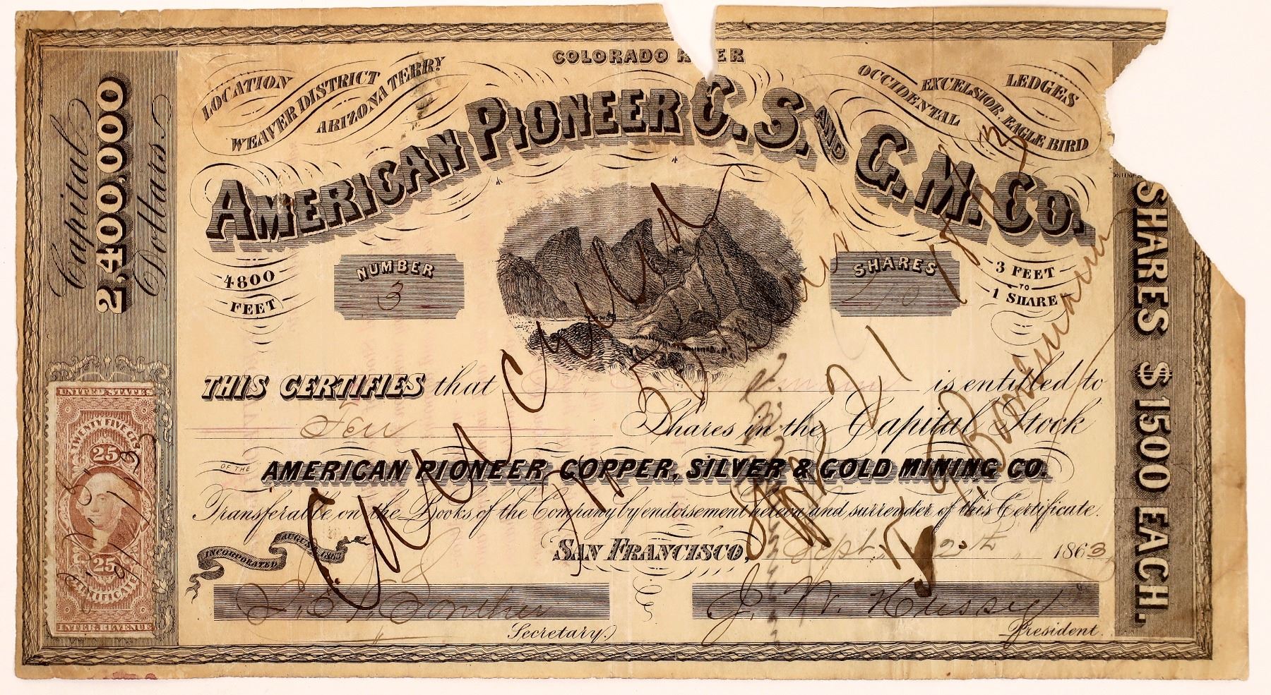 Incorporated August 1863. "Location Weaver District Arizona Territory" (printed at upper left). "Ledges Excelsior, Eagle Bird, Occidental" (printed at upper right). Low certificate #3, dated Sept. 2, 1863 for 10 shares made out to F. (Francis) G. Bornemann. (signed on back). Signed by President J. W. Hussey and Secretary J. (Joseph) N. Souther. Bornemann is listed in Langley's 1865 San Francisco Directory (p. 87) as working in the cashiers office of the U. S. Assistant Treasurers. Office at 606 Montgomery St., room #3 (notice of a $1 assessment levied; ref.: Daily Alta California, Volume 15, Number 4975, October 12, 1863). Souther is listed in Langley's 1865 San Francisco Directory (p. 410) as a receipt clerk in the U.S. Branch Mint. Cancelled. A vignette of mountains with a stagecoach. A brown 25 cent Internal Revenue Certificate stamp attached. Black on white; 5.5 x 9.5 inches, printer not identified. Two major tears. Cancelled. Old and wrinkled. Still a great find! The Weaver district is situated about 16 miles northeast of Wickenburg. A Mexican member of a prospecting group unearthed gold nuggets "the size of potatoes." The party members pried them from the ground with knives. Prospectors dubbed the basin the Potato Patch, the mountain Rich Hill and the mining region Weaver District No. 2. The district became Arizona's richest producer of placer gold. Major claims included the Devil's Nest, the Leviathan and the Upton. Miners poured into the district, panning more than 25,000 ounces of gold in the first five years. Weaver District Arizona 1863