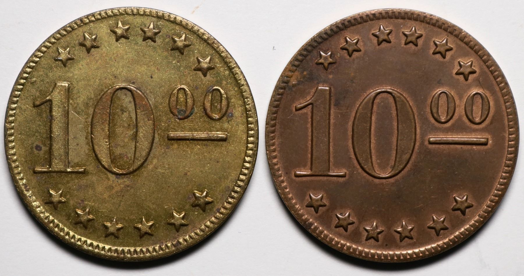 Both are '10.00' 2350 with blank backs. American counters were as important c1850-1870 as Hard Times and Civil War tokens. This is a significant collection as it comes from the L. B. Fauver collection – with his notations on the counter holders.