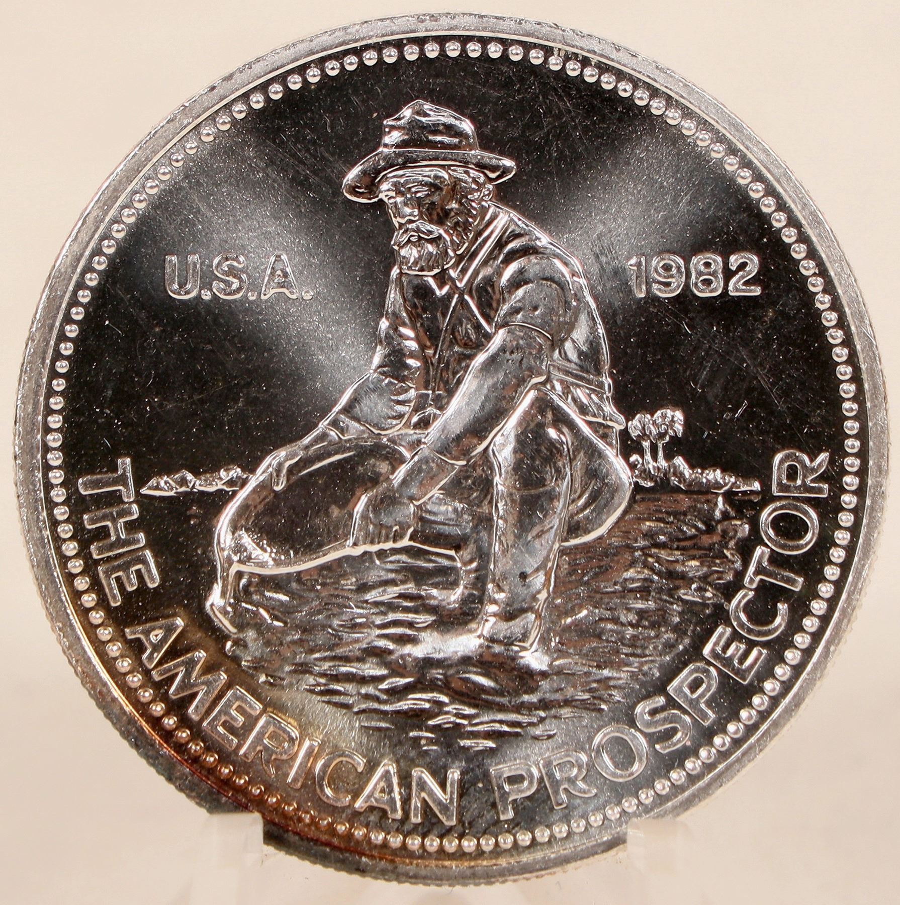 Made by Engelhard in 1982. One troy ounce, 999+ fine silver with an iconic miner panning on the obverse. A bit of toning at the bottom.