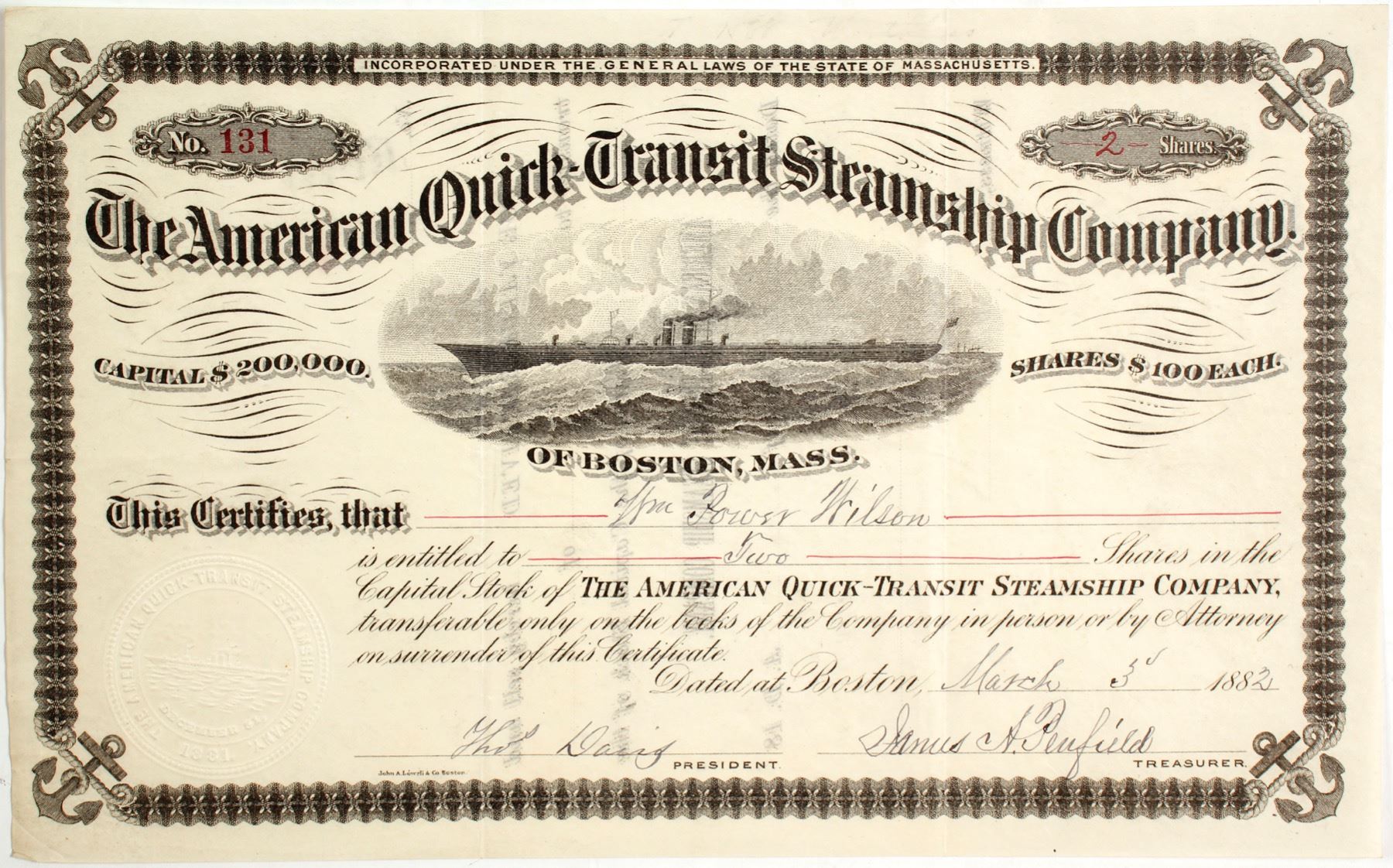 Rare. I/U #131 Wm Wilson 2 shares 1882. Steam ship vignette. Signed by President James Penfield. Builder of fast ships that were thought to be unsinkable unless torn to pieces, no masts or sails. Prag Collection. State: Massachusetts City: Date: 1882 HWAC# 83351