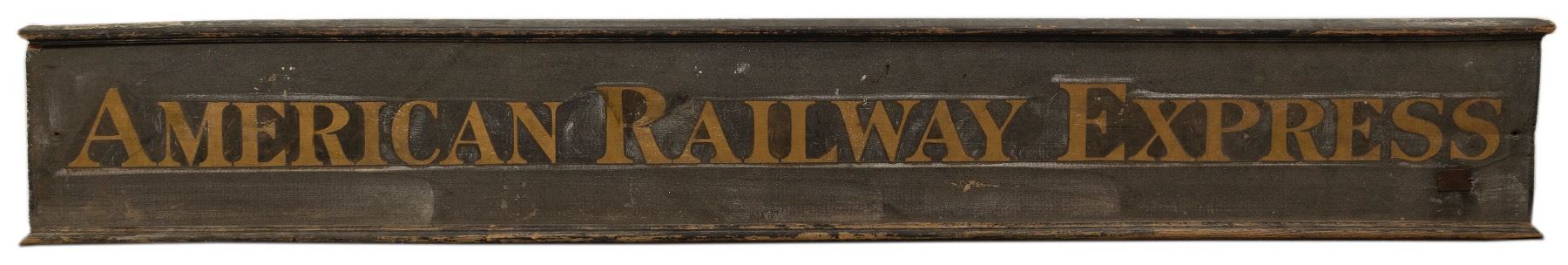 American Railway Express wood sign, 10.5" x 70". Fabulous condition. The Railway Express Agency (REA) was a national monopoly set up by the United States federal government in 1917. Rail express services provided small package and parcel transportation using the extant railroad infrastructure much as UPS functions today using the road system. The United States government was concerned about the rapid, safe movement of parcels, money, and goods during World War I and REA was its solution to this problem. Date: Location: HWAC# 38656