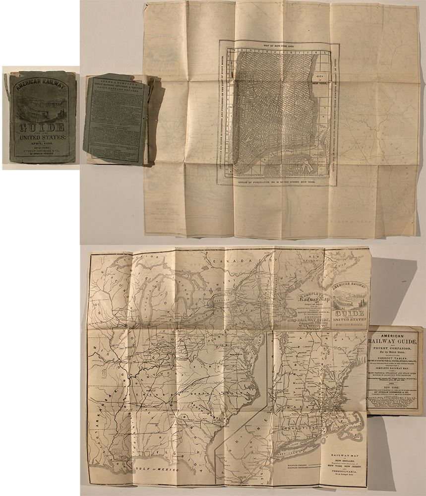 Pocket Companion, for the United States and Canada Containing Correct Tables for Time of Starting from all Stations, Distances, Fares, Etc. on all the Railway Lines in the United States; Together with a Complete Railway Map. Also the Principal Steamboat and Stage Lines Running in Connection with Railroad. ByR S Fisher. Published On the 1st of Every Month By Dinsmore & Co (1852). Includes a map of rail lines. 13 x 16". 144 pages. Covers in very poor condition. Map and pages in very good condition.