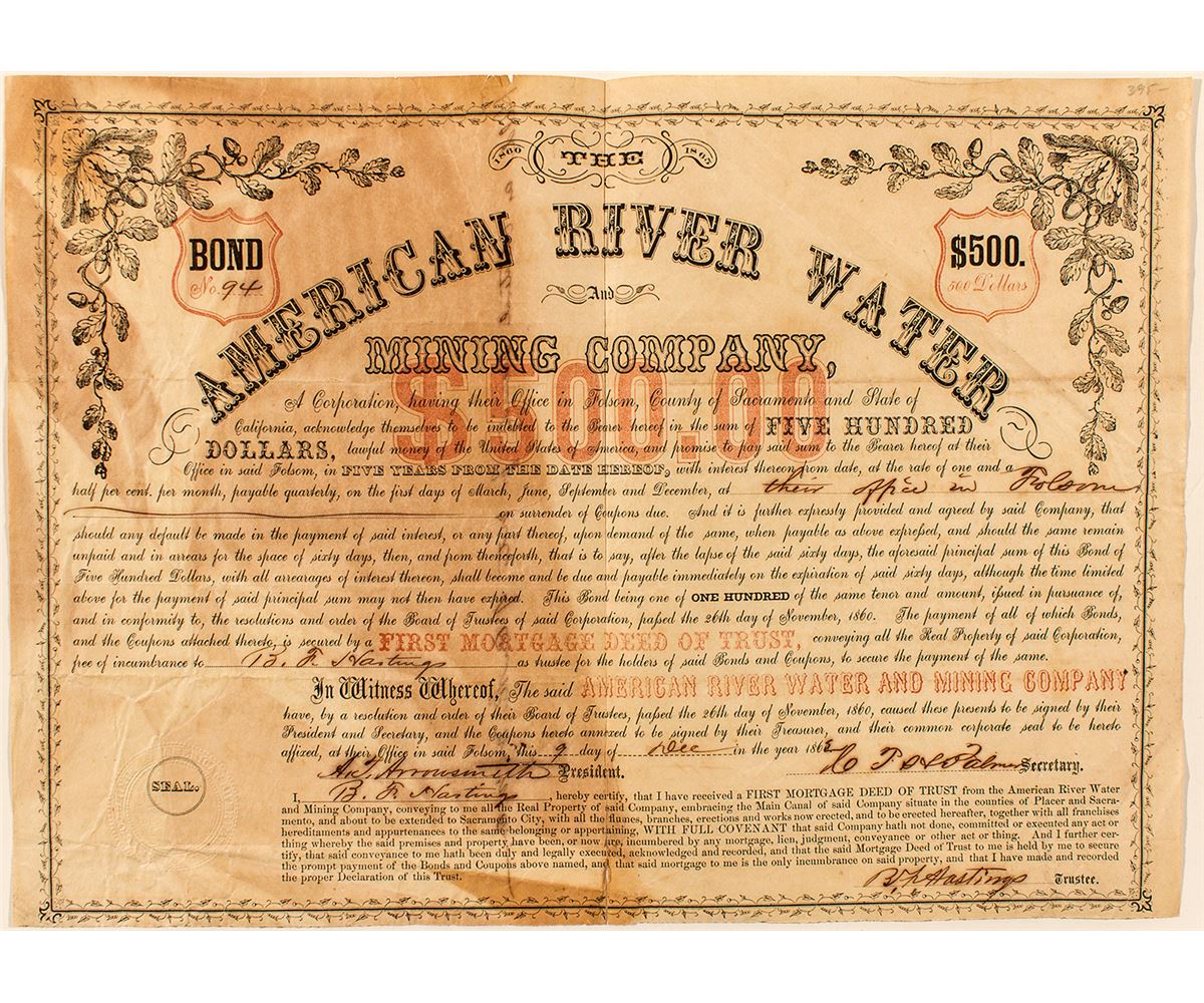 RARE! Number 94 for $500. To B. F. Hastings, trustee. Signed by A. T. Arrowsmith and (?). The American River Water and Mining Company was formed in 1854 to build a ditch to divert water from the North Fork of the American River. The North Fork Ditch was dug from 1854-1856, and provided water for drinking, irrigation and mining operations to areas that are now Northeast Folsom. Toning. Two inch rip along bottom fold. Delicate paper. 14 1/2 x 8 1/2". (Prag Collection)