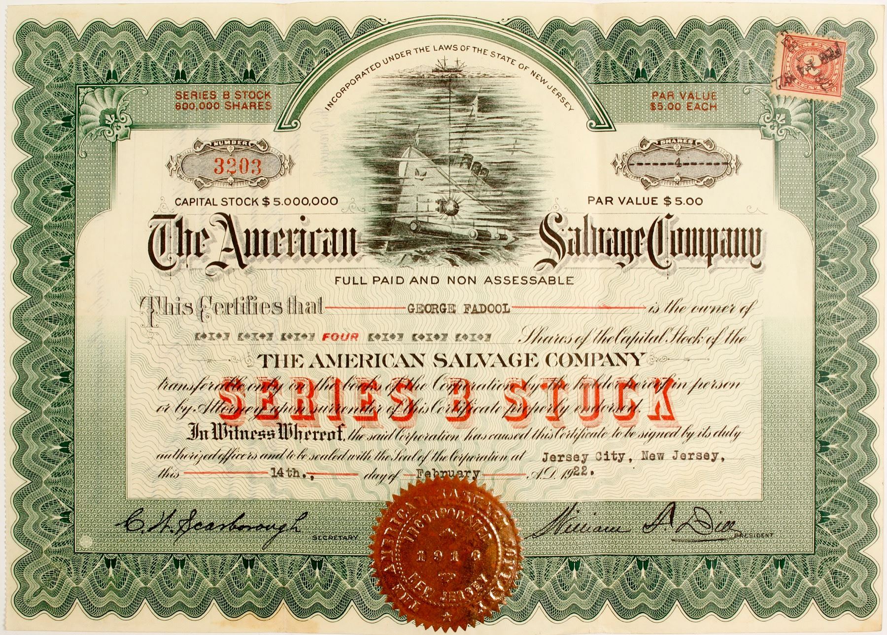 Rare variety, red underlay. I/U #3203 George Fadool 4 shares 1922 signed by President Dill. Cool salvage vignette. Prag Collection. State: New Jersey City: Date: 1922 HWAC# 83429