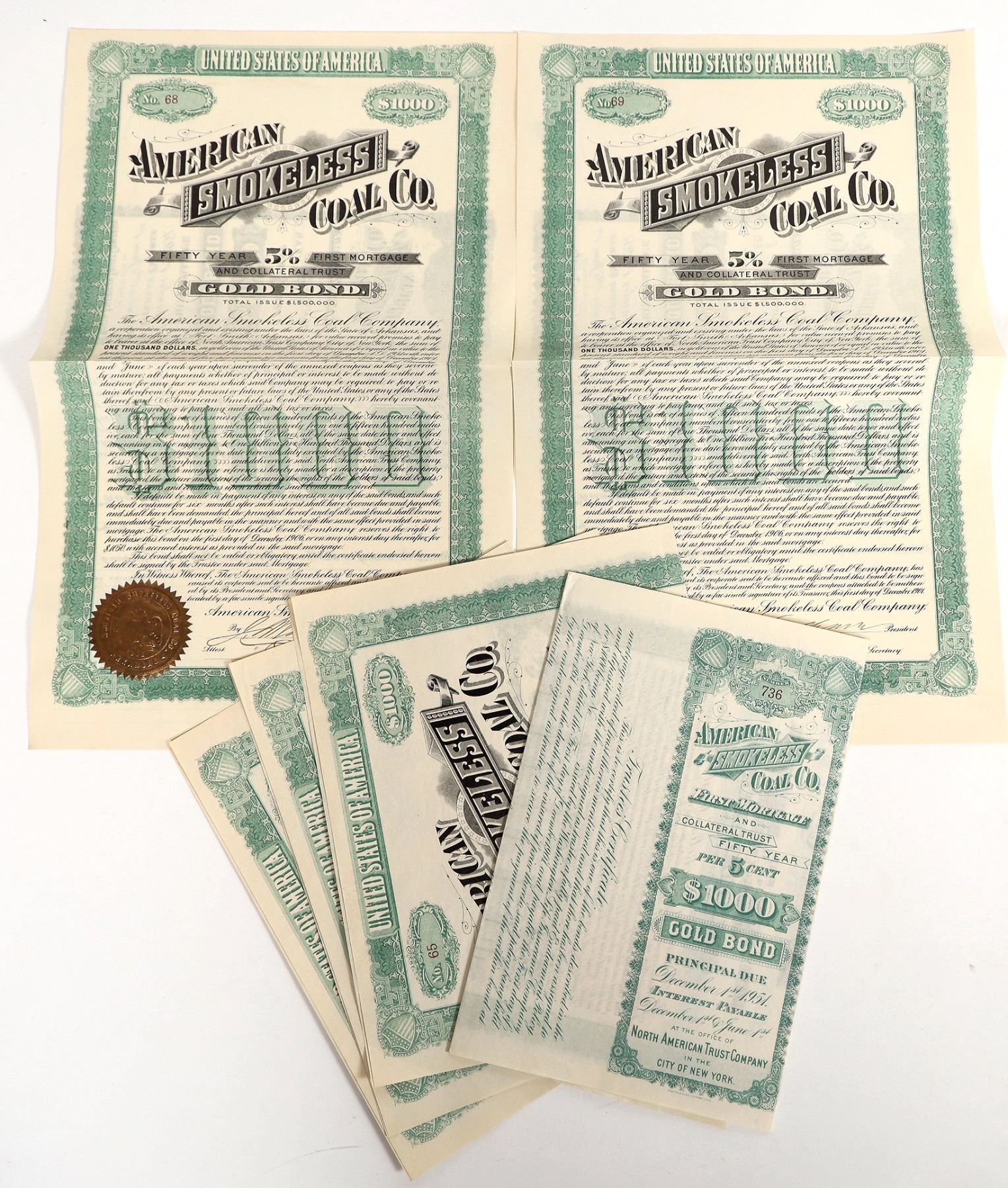 Group of six $1000 bond certificates from the American Smokeless Coal Company, all dated 1904. No. 65-69 and No. 736 issued. Certificates are signed by president and treasurer of company, both illegible. All issued and uncancelled, all have gold embossed company seals. All in great condition.