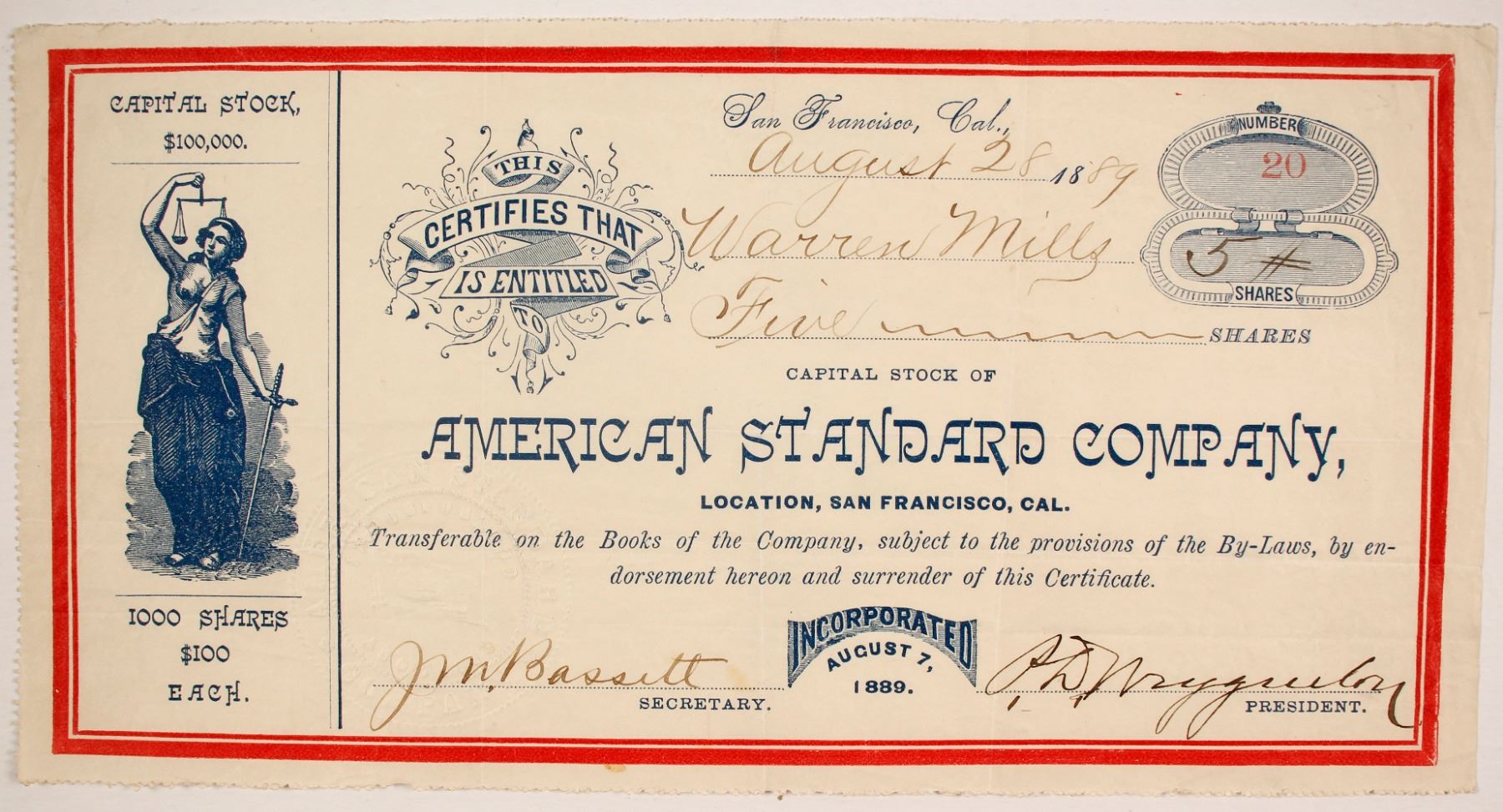 # 20 for 5 shares to Warren Mills. Signed by JM Bassett and president PD Mygruton(?). Dateline San Francisco 1889. Incorporated August 7, 1889. Not cancelled. Vignette of semi nude allegorical lady of justice. No printer. Small edge wear. Very nice. Incorporated for the purpose of publishing books, newspapers, periodicals ,etc. Ken Prag Collection