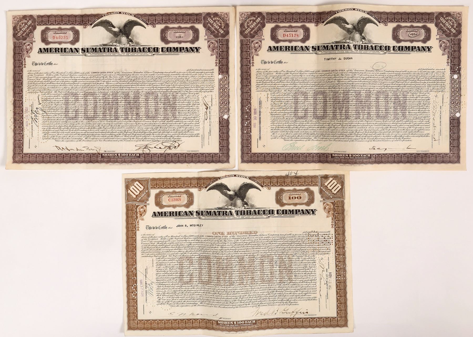 Lot of 3 stocks, issued 1921-24. Punch cancelled. Three different vice president signatures. Brown or purple borders, black print, and vignette of bald eagle on top of bee hive. Printed by ABN. 9.25 x 13" Folds. In 1891, A. Cohn & Company purchased 14,000 acres for tobacco cultivation and named it Amsterdam. At that time, the property was the largest tobacco plantation in the world, under one ownership. In 1907, seven of the larger growers and packers in the area merged to form the American Sumatra Tobacco Company, with a division in Amsterdam. This was a company town with offices, railroad, commissaries, post office, packing houses and employee houses. The Imperial Tobacco Company bought the American Sumatra Tobacco Company in 1955 and operated it until 1965. Decatur County Georgia