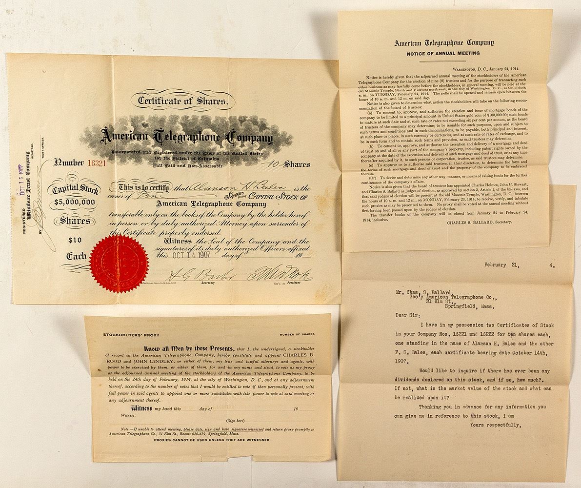 Rare. Inc. in the United States for the District of Columbia. No. 16321, issued for 10 shares on Oct. 14, 1907. Signed by the Assistant to President and the secretary. Not cancelled. Red seal. 8.5" x 11.5" Folds with light soiling. Also included are a 1914 notice of meeting for the company, an unused transfer form, and a letter asking if any dividends are due. City: State: District of Columbia Date: 1907 ID# 34755