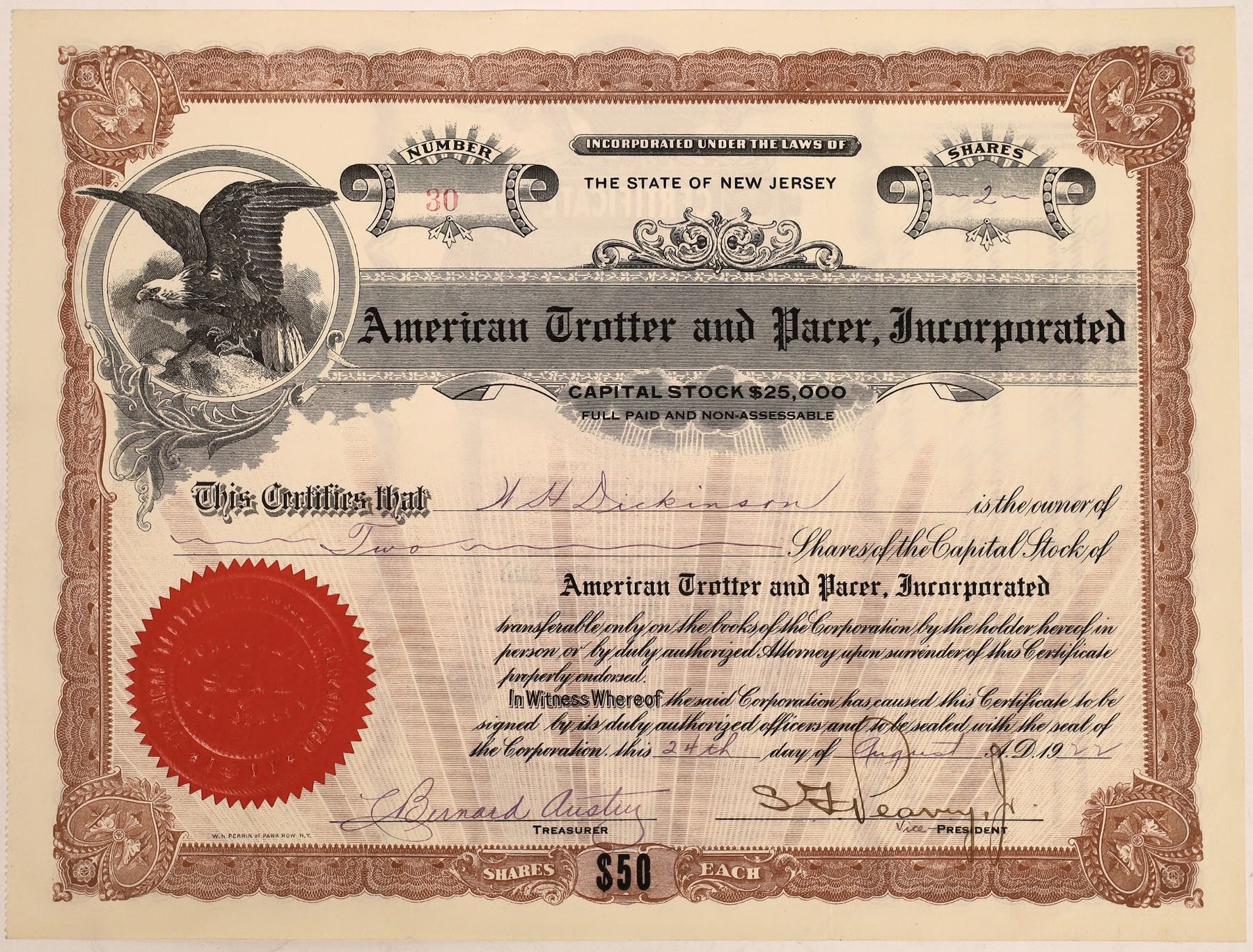 Rare certificate from this horse racing related company. Cert. #30, issued for 2 shares in 1922. Inc. in New Jersey. VF. Uncanceled. New Jersey 1922
