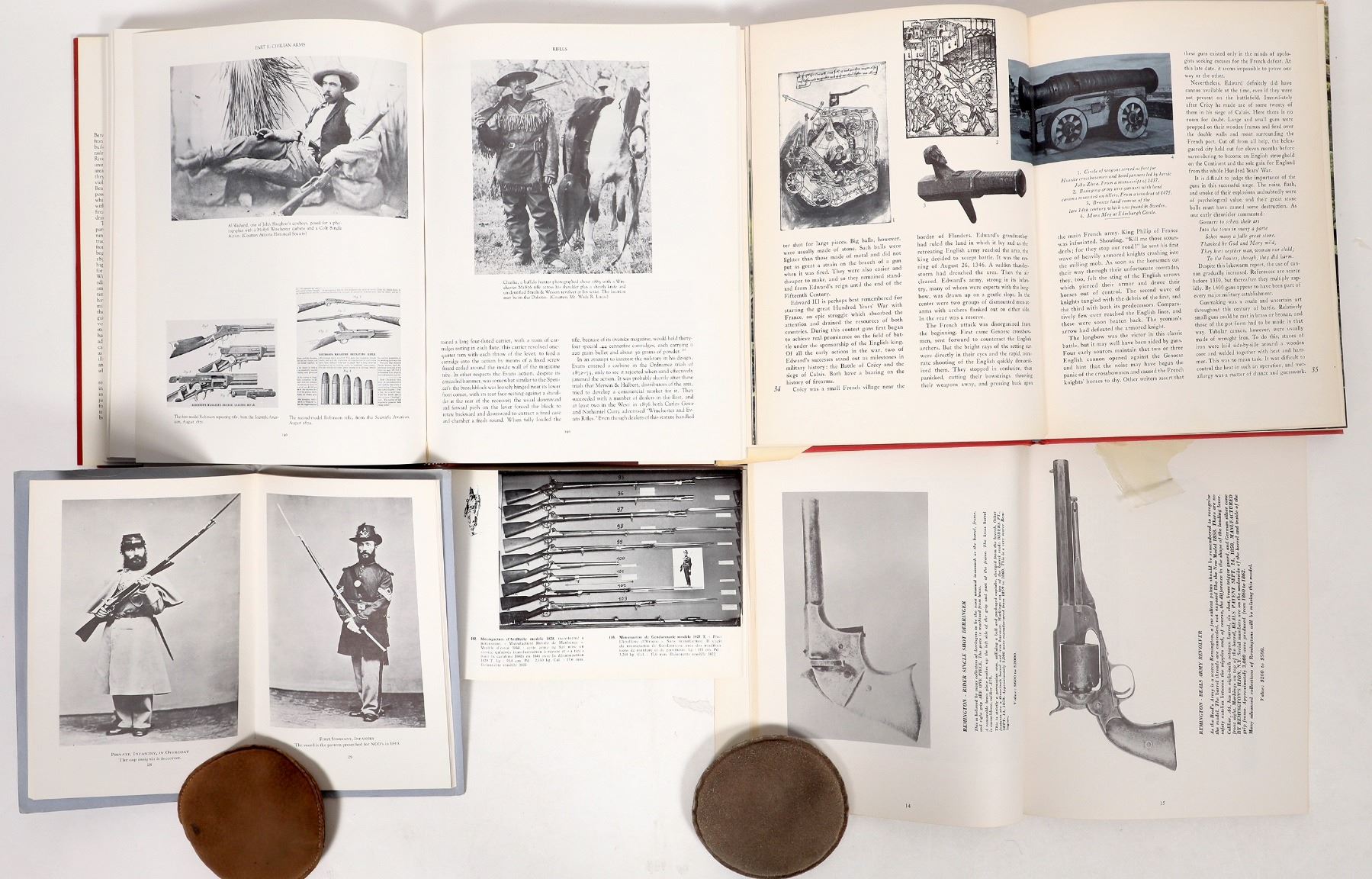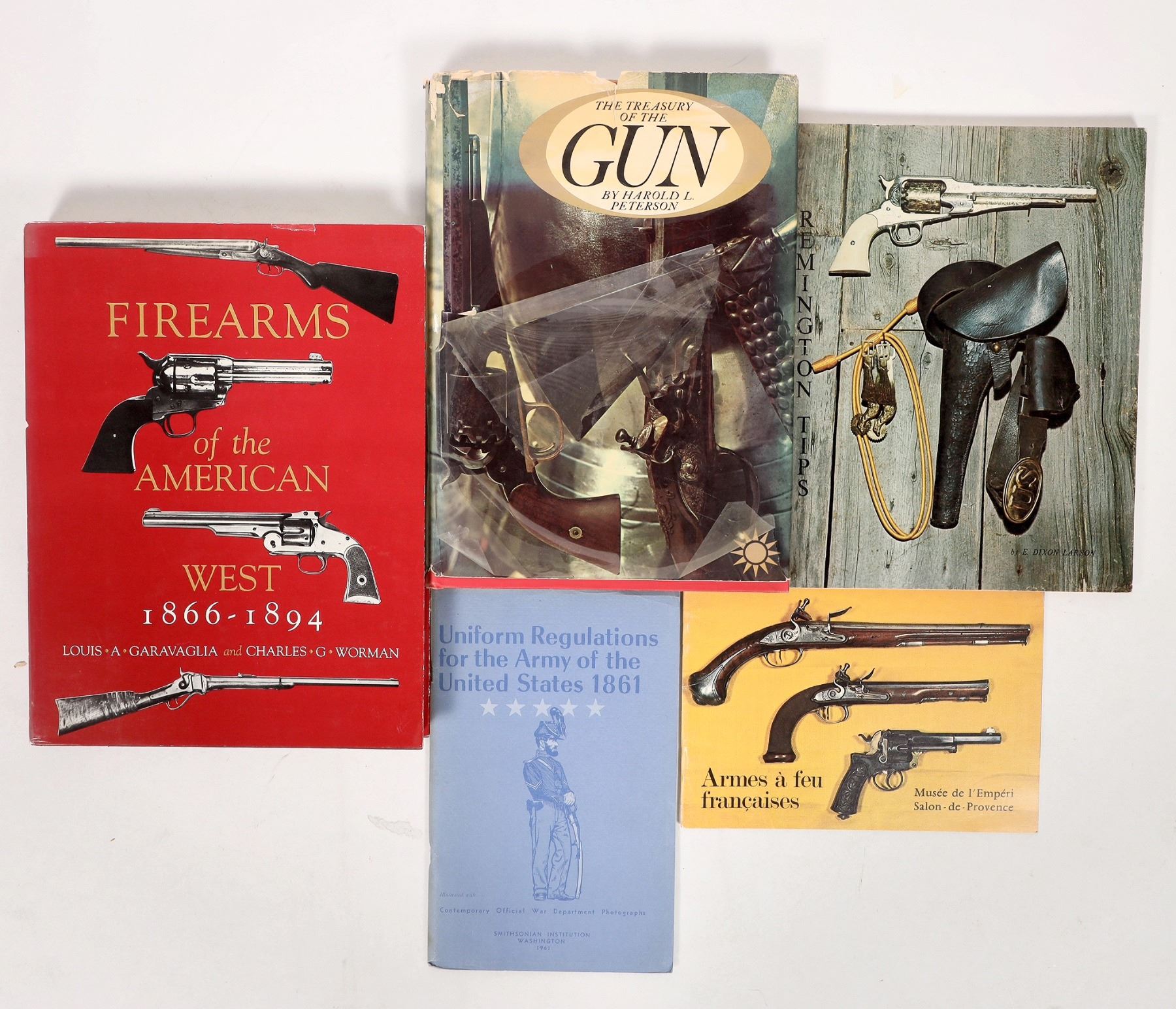 A collection of 4 books about guns of the American West, including: "The Treasury of the Gun," Harold L. Peterson, Golden Press & Ridge Press, 1962, hardback, dust jacket, 249 pp., dust jacket wear, cover fading at top, otherwise very good; "Firearms of the American West, 1866-1894," Louis A. Garavaglia and Charles G. Worman, Univ. of N.M. Press, 1985 First Edition, hardback, dust jacket, 413 pp., dust cover slightly worn, otherwise mint; "Remington Tips," E. Dixon Larson, Pioneer Press, 1975, paperback, 99 pp., cover and spine worn, otherwise good; and "Uniform Regulations for the Army of the United States 1861," Smithsonian Institution, Washington, 1961, paperback booklet with illustrations, 61 pp., cover slightly worn with some fading, otherwise good.
