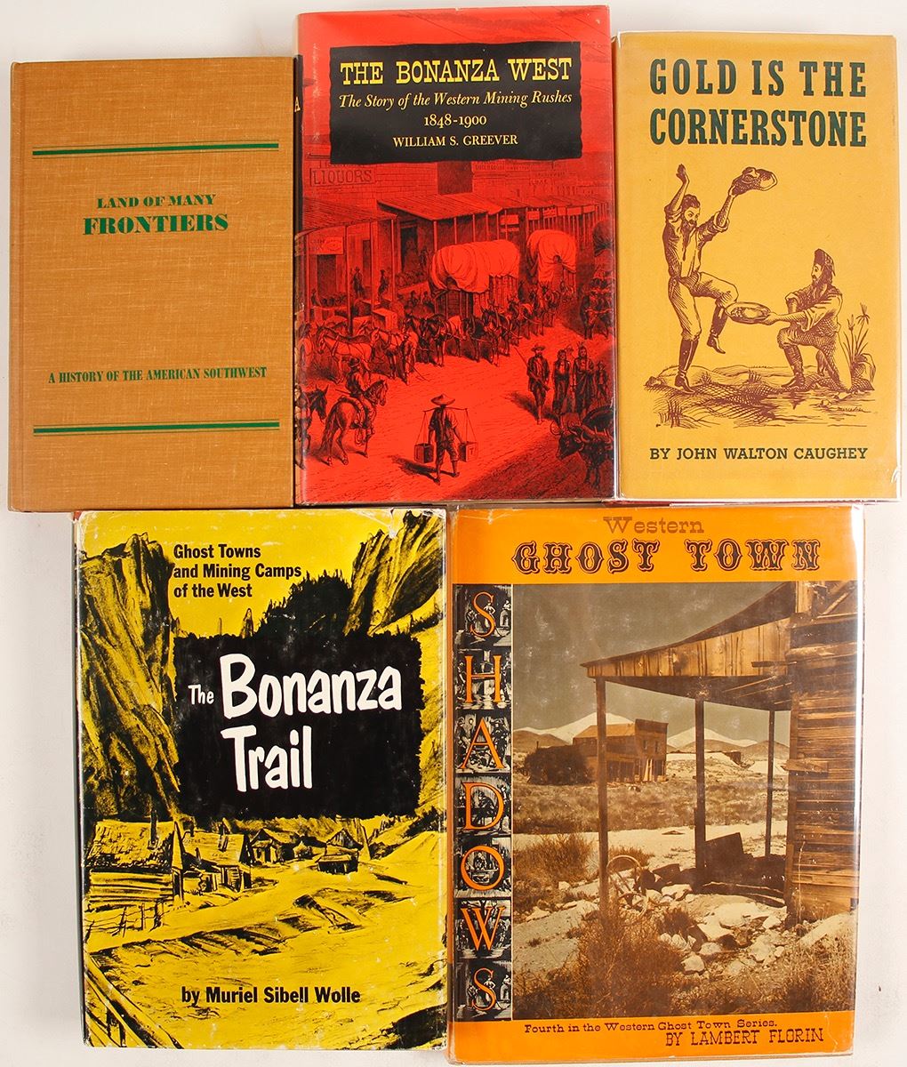 5 hardcovers. land of Many Frontiers by Faulk, Gold is the Cornerstone by Caughey, The Bonanza West by Greever, The Bonanza Trail by Wolle, Western Ghost Town Shadows by Florin Date: Location: HWAC# 63342