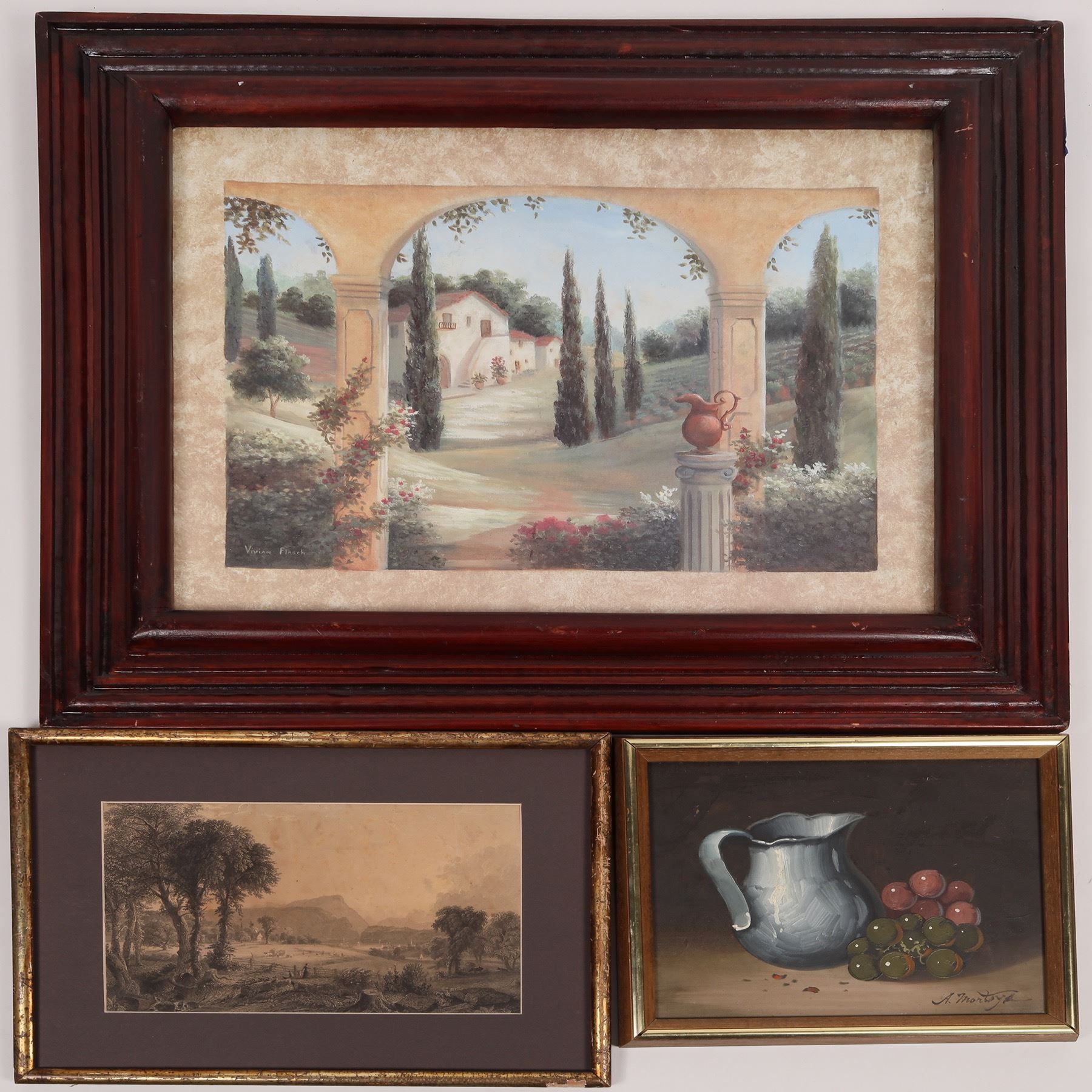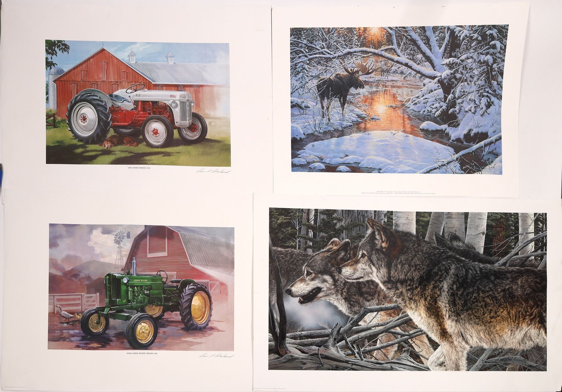 7 prints. Ford tractor 18.5x24", Moose by McGuire 17x23", John Deere 18.5x24", 2 wolves 18.75x29". 3 framed-Outdoor scene 20x24.5", American Harvesting 9.75x14" with cracked glass, vase/grapes by A. Montoya 8x10" City: State: Date: