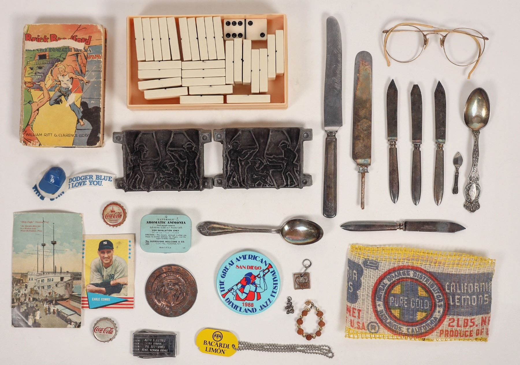 Assorted American. Pair of 4.5x3" lead molds with random pattern, 8x silverplate cutlery, 2x Coca Cola cap, old eyeglass frame, vintage domino set-may be complete? etc. See photo.