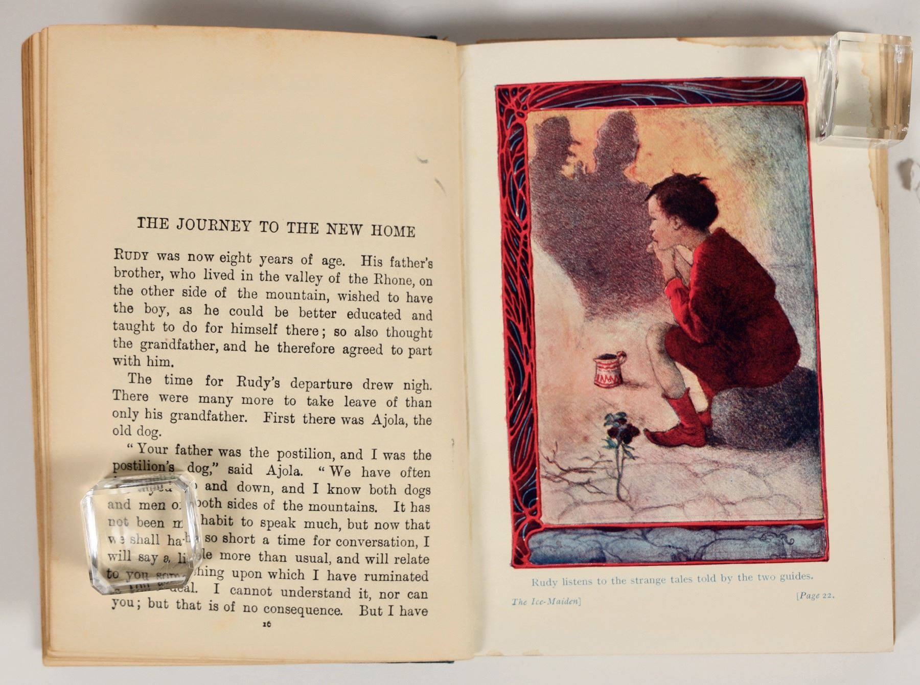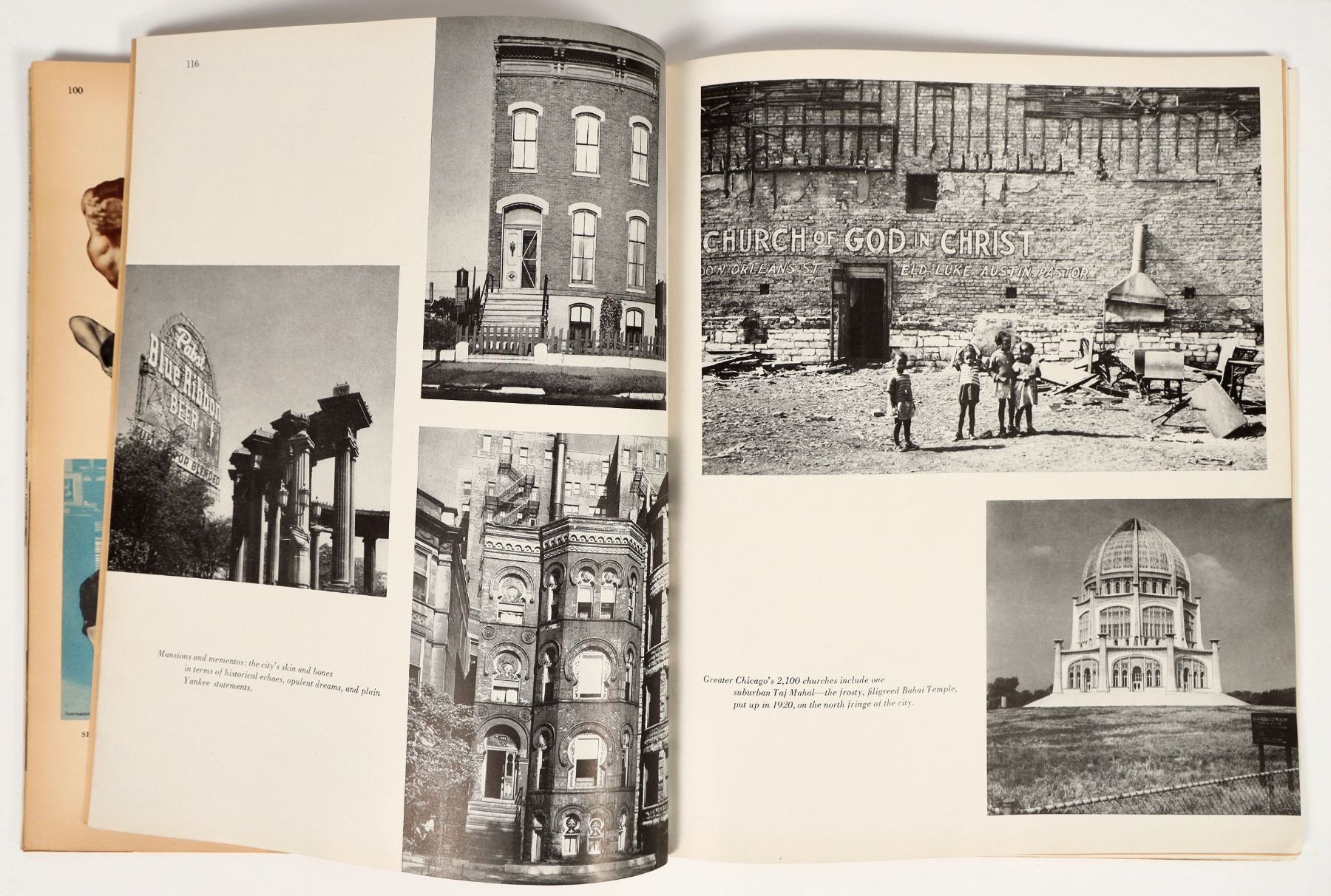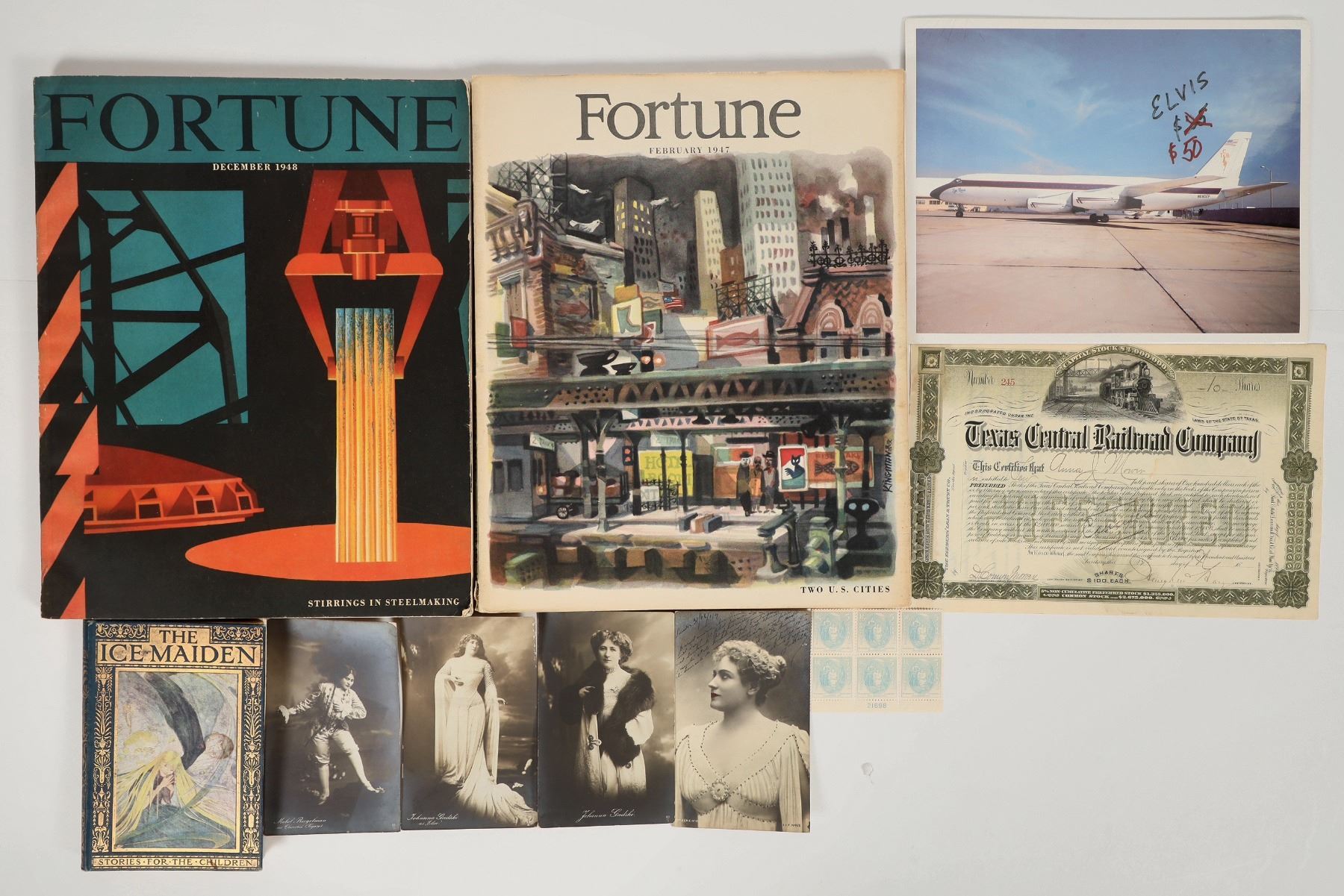 Americana group including 2 different Fortune Magazines in like-new conditions (Feb 1947 & Dec 1948) with light wear to the exterior, Railroad Stock, 6 duplicate stamps, antique book with appealing gilded cover, 1st communion save-the-date in Spanish (1922), photo self-ID'ing being Elvis's private jet, & 4 photo postcards in a tasteful black & white, c1901. All in generally good condition. See photo.