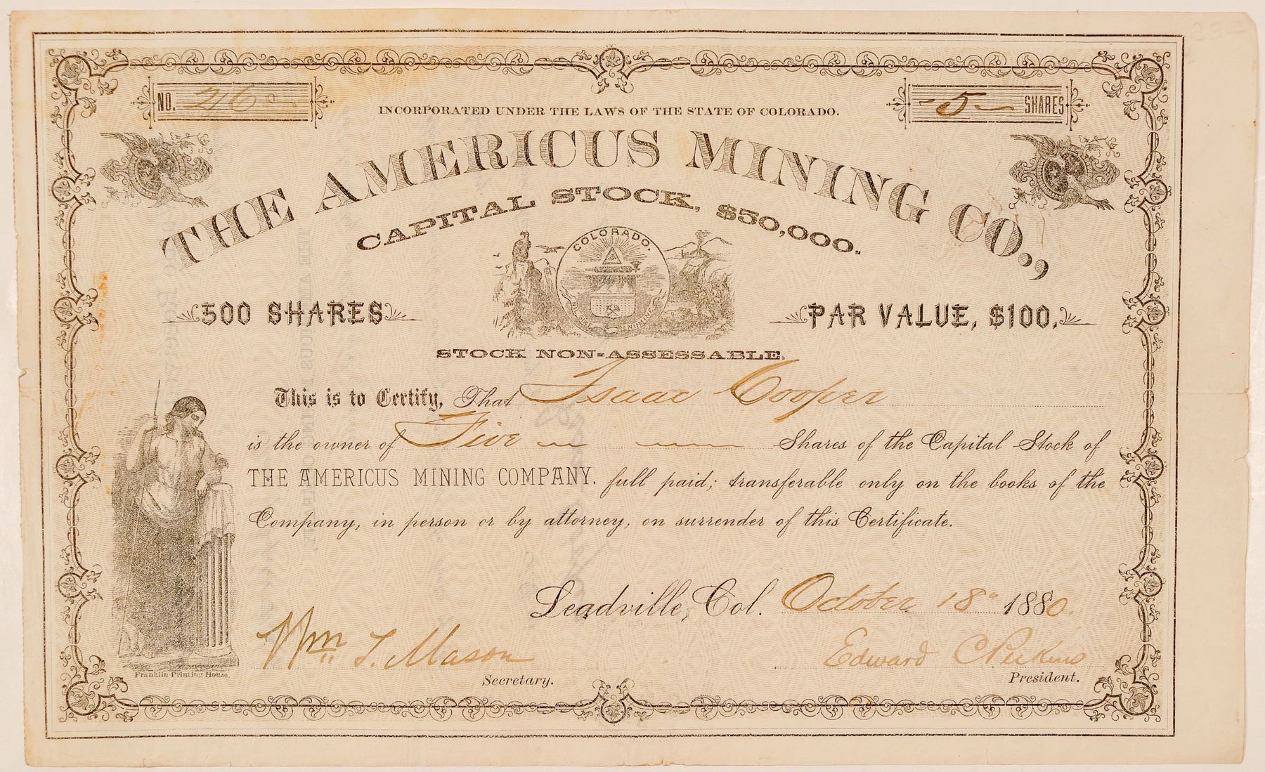 Early 1880 issued in Leadville. Inc. in Colorado. No. 26, issued for 5 shares to Isaac Cooper on Oct. 18th, 1880 in Leadville. Signed by president Edward C. Perkins and secretary William Mason. Not cancelled. Floral border and two vignettes: allegorical woman (bottom left) and state seal (top center). Printed by Franklin Printing House. Pinholes, folds, tape repaired spindle hole. 6.75 x 11" Capt. Isaac Cooper was founder of the town of Glenwood Springs. The 1879 Colorado Mining Directory lists Americus mines in Boulder County and Gilpin County. The 1883 Directory lists an Americus mine in Gilpin County, but not Leadville. This has been presented elsewhere as a Leadville property, but no direct link could be found. The Americus Mine in Central City was the site of a mine disaster in August 1895 that resulted in miners drowning underground. Americus was also the name of a mining town in Chaffee County. () State: Colorado City: Leadville Date: 1880