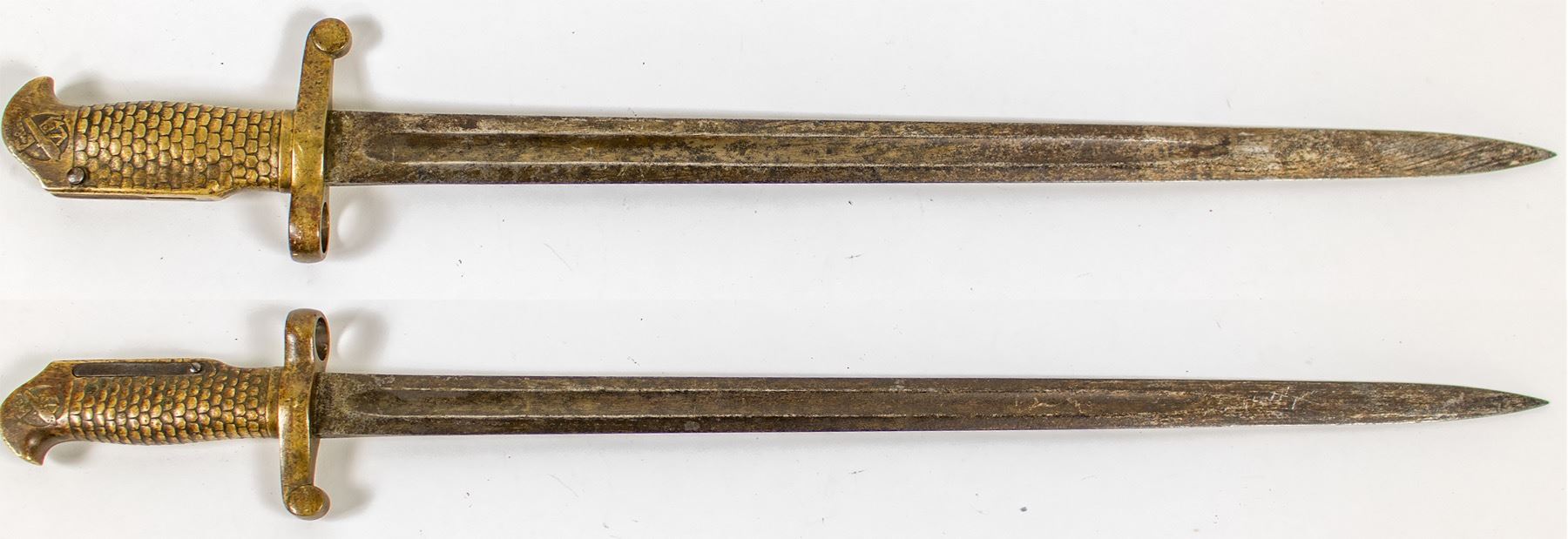 This model 1870 Springfield Armory Navy Rolling Block rifle bayonet is marked ‘U.S.N. G.G.S. 1870 and AMES MFG. CO. CHICOPEE MASS.’ It has a brass fish scale handle and a muzzle ring of .077” Condition is about 70%. State: City: Date: ID#42727