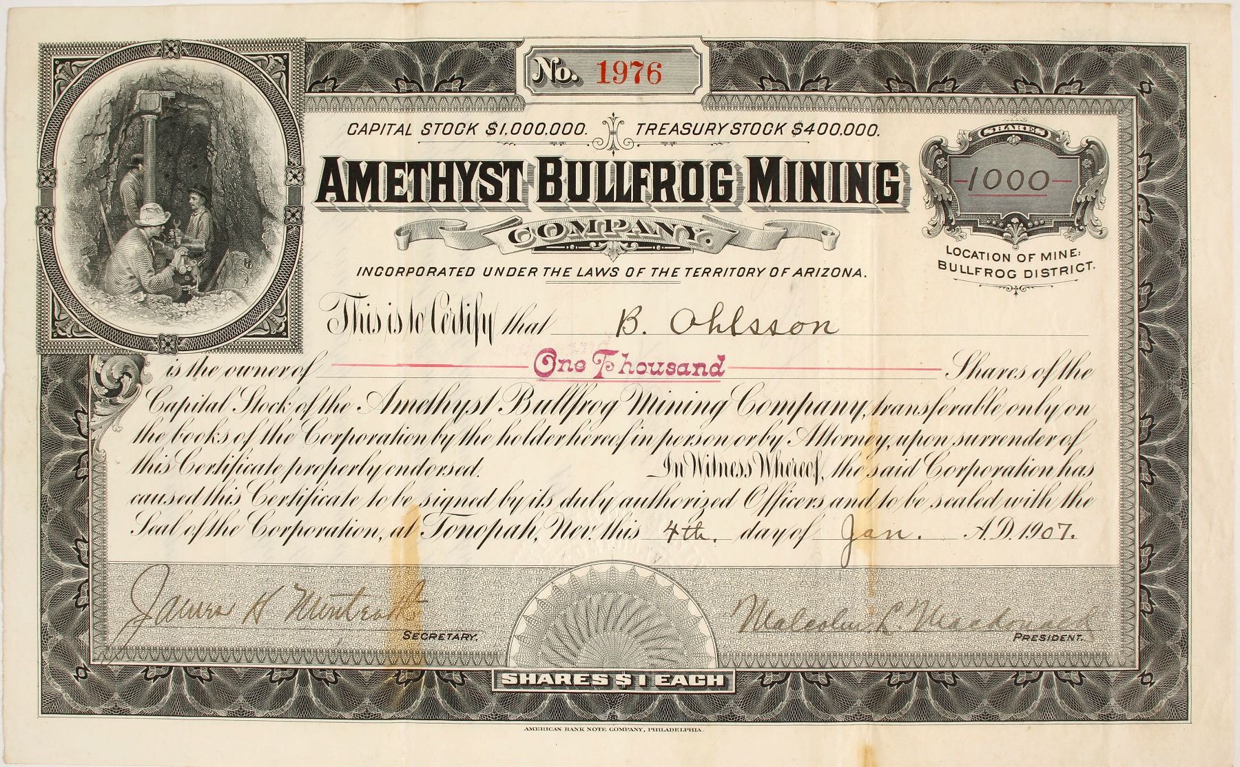 Inc. in Arizona. Cert. #1976 Issued for 1000 shares in 1907. Issued to B. Ohlsson and signed by Malcolm Macdonald as president. Printed by ABN. The Amethyst Bullfrog is on the divide just north of the Montgomery Shoshone. It was an interesting prospect with no mineable orebody, but was an important piece of property for the Montgomery Shoshone in later years. Tiny stains at folds. Miners underground. Uncanceled.