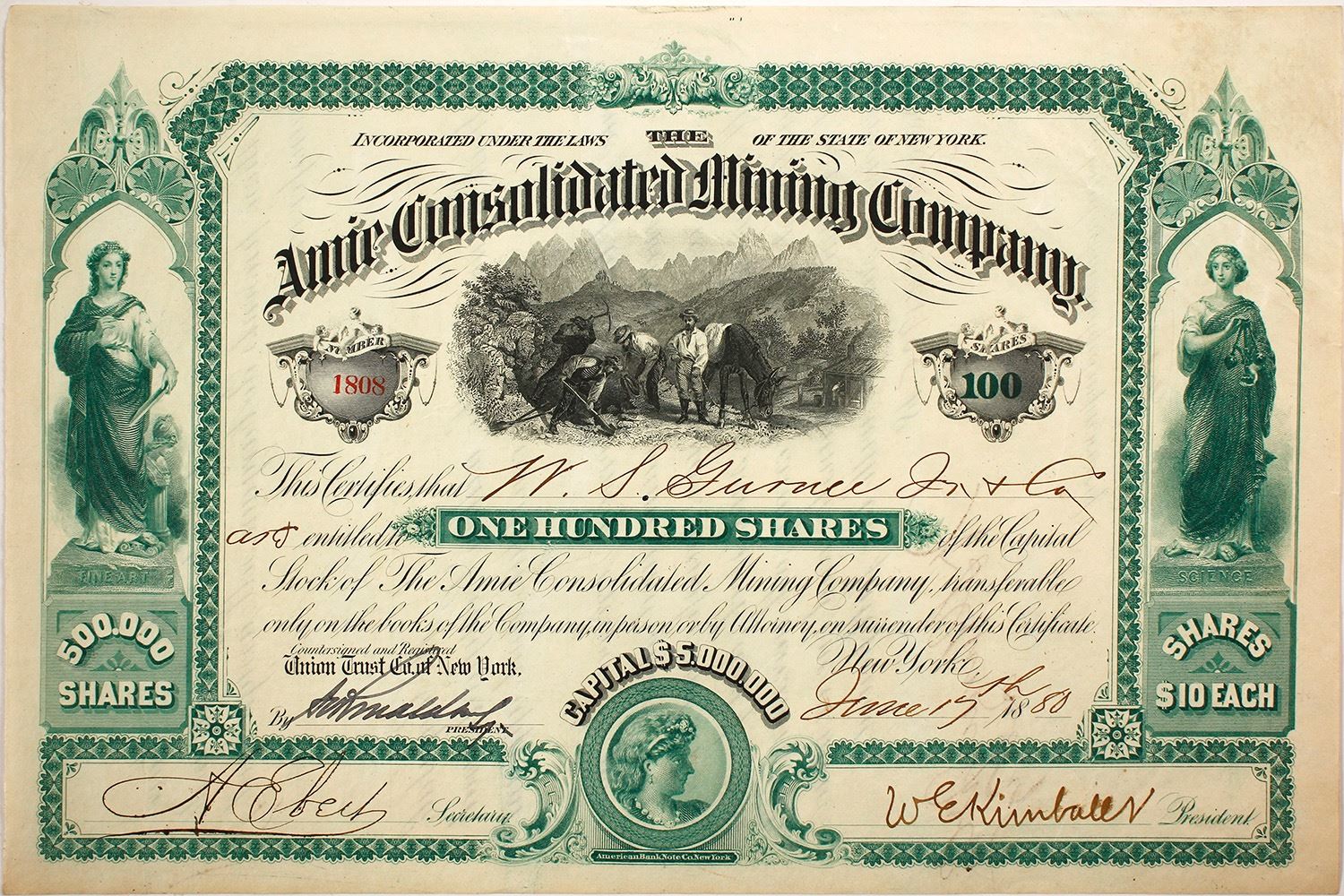 Inc. in New York. No. 1808, issued for a 100 shares to W.S. Gurace & Company, June 17th, 1880. Signed by president Kimball and secretary Ebert. Not cancelled.Green and black print. Surface mining vignette and two allegorical women vignettes in borders. Printed by ABN. Folds, some toning. According to Burchard, it was located in the Fryer Hill district of Leadville, Colorado. In 1883, it had been consolidated with the Deer Lodge property, totaling 15 acres. Productive through leasing with pockets of carbonate ore being found. Dividends to date amounted to $305,000. Water encountered at a depth of 482 feet when they were looking for a second contact [pg. 484]. Date: Location: Leadville, Colorado HWAC# 60912