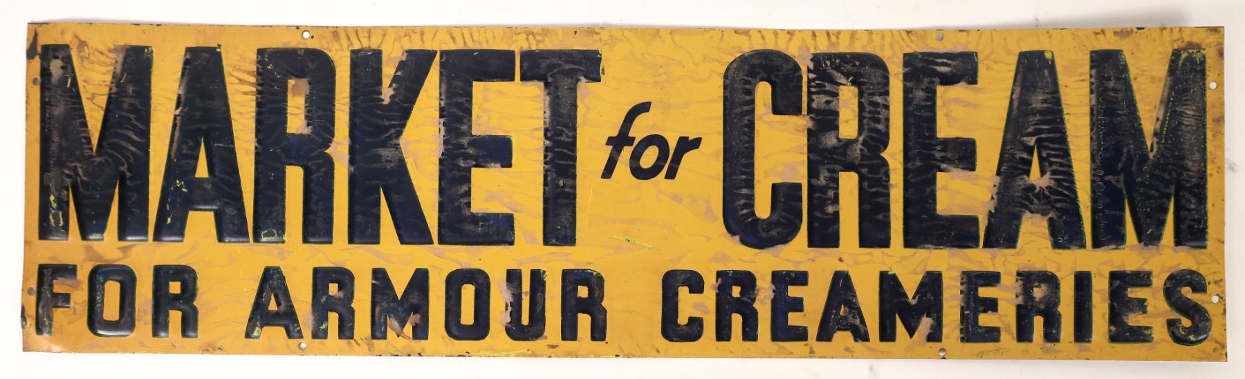 Amour Creameries metal & porcelain sign measures 4"x 20". Slight surface wear. Armour Creameries (Not to be confused with the meat company), were located all over the United States. No nail damage. 1930s