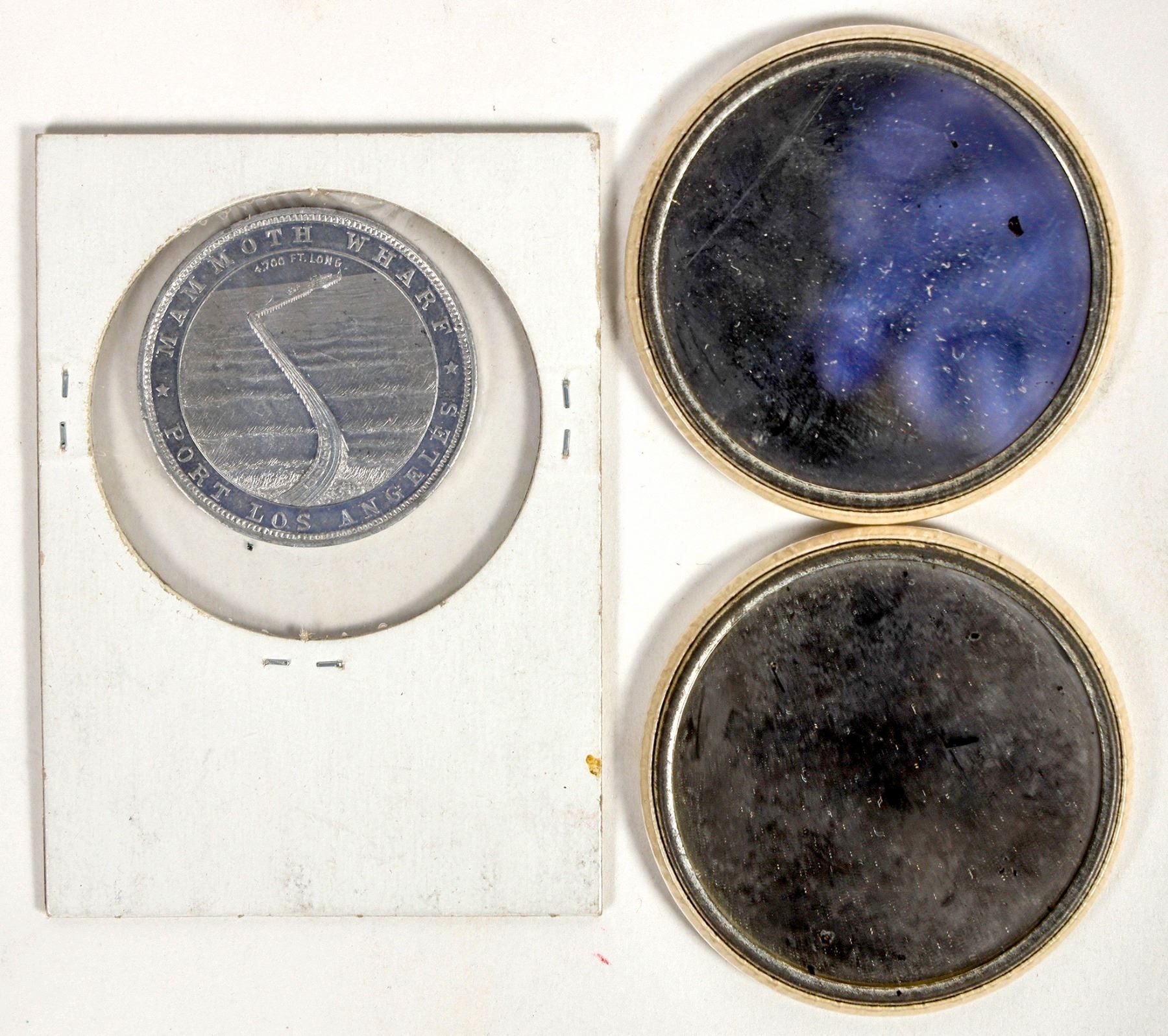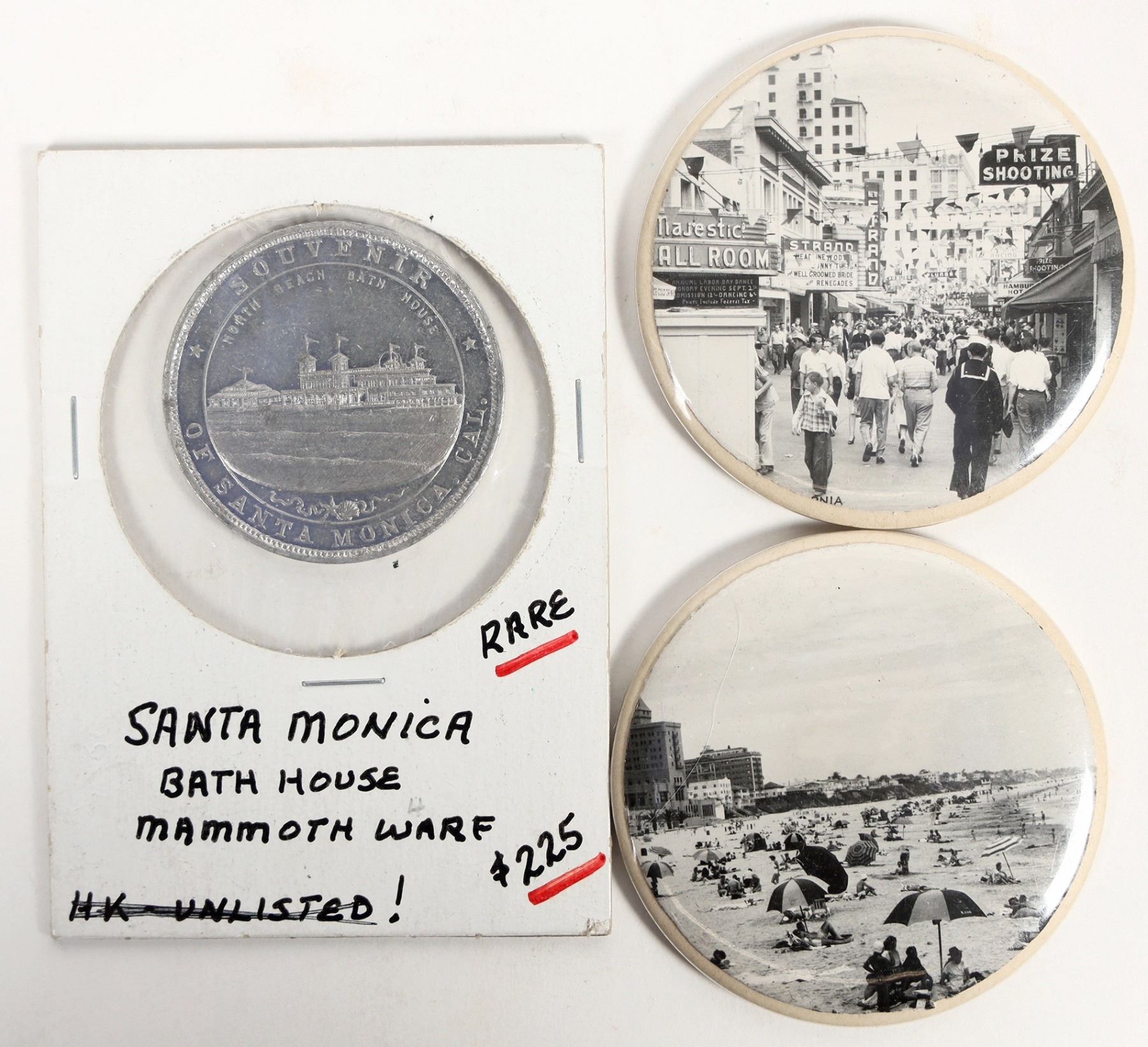Two pocket mirrors and one aluminum medal from beach-side attractions near Los Angeles, California. Mirrors (55mm diameter) are attributed by the consignor as being from The Pike at Long Beach. One shows an B&W image of a resort beach scene with umbrellas, the other is an arcade with signs for the Majestic Ball Room and Prize Shooting attractions. The aluminum medal (38mm diameter) reads, obv: // MAMMOTH WHARF / PORT OF LOS ANGELES // with an image of the wharf and the words // 4,700 FT.LONG. // above it; rev: SOUVENIR / OF SANTA MONICA, CAL. // and // NORTH BEACH BATH HOUSE // over an relief of the attraction.