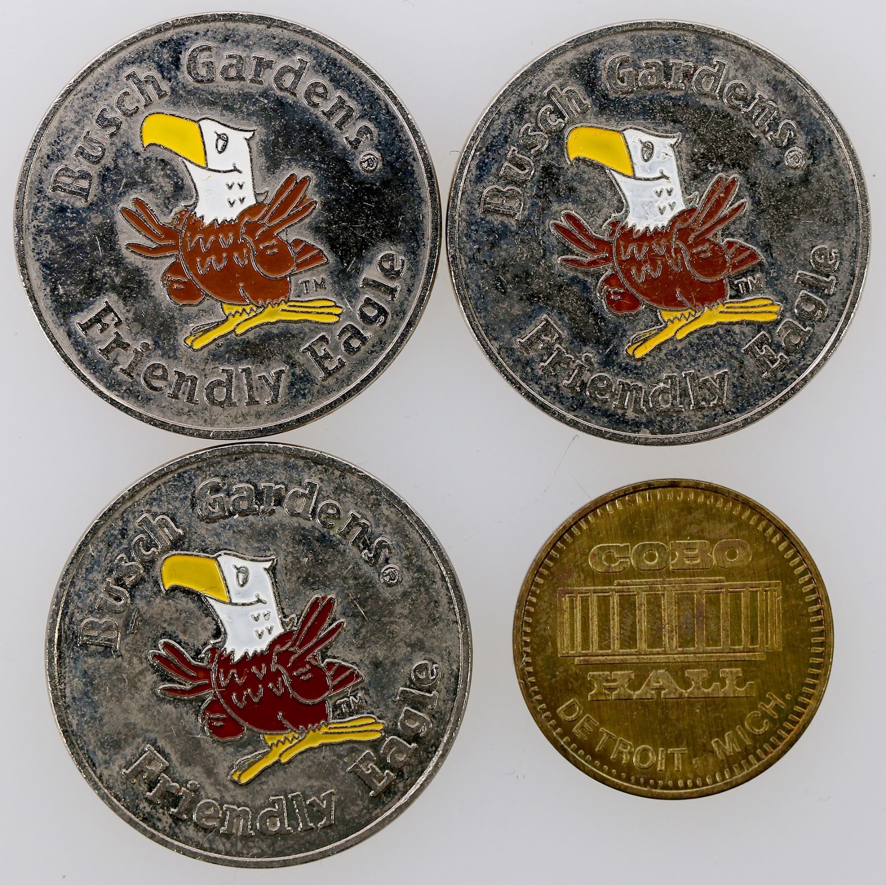 Group of 4 amusement park tokens from Busch Gardens and Cobo Hall. Good condition; see photos.